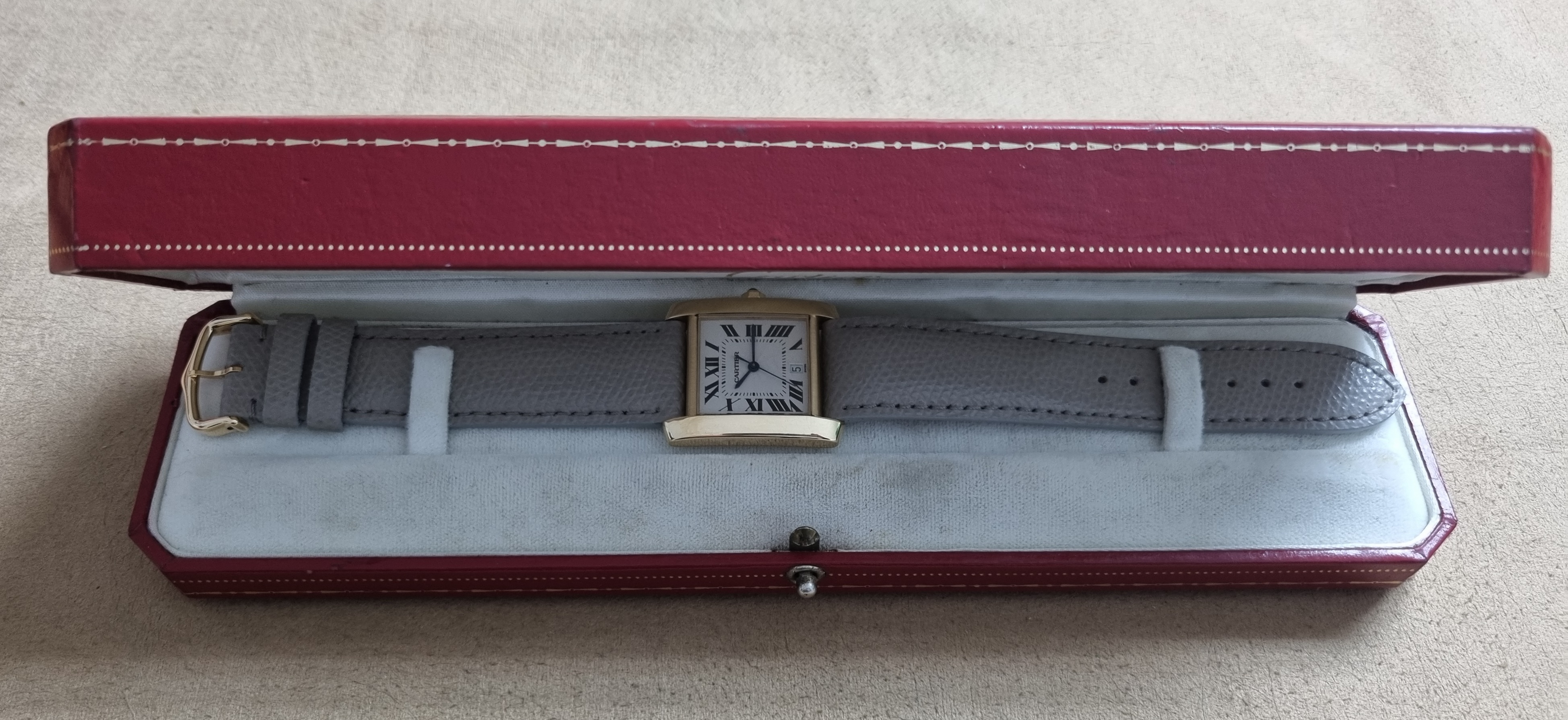 Cartier Tank Française 1840 Yellow Gold 18 Kt Silver Dial Automatic On Grey Leather Strap - Box. CARTIER TANK LADY'S REF. 1840 Yellow Goold Very fine, self-winding, 18K yellow gold lady's wristwatch with date.; Brand Cartier;Model Tank;Reference Ref. 1840;Year Made in the 2000s;Caliber 120;Bracelet Grey Leather new strap Cartier with 18 Kt yellow gold Cartier buckle;Accessories Original fitted box no papers ;Dimensions 28 x 32 mm.;Signed Dial, Case , Movement, Buckle and Strap.