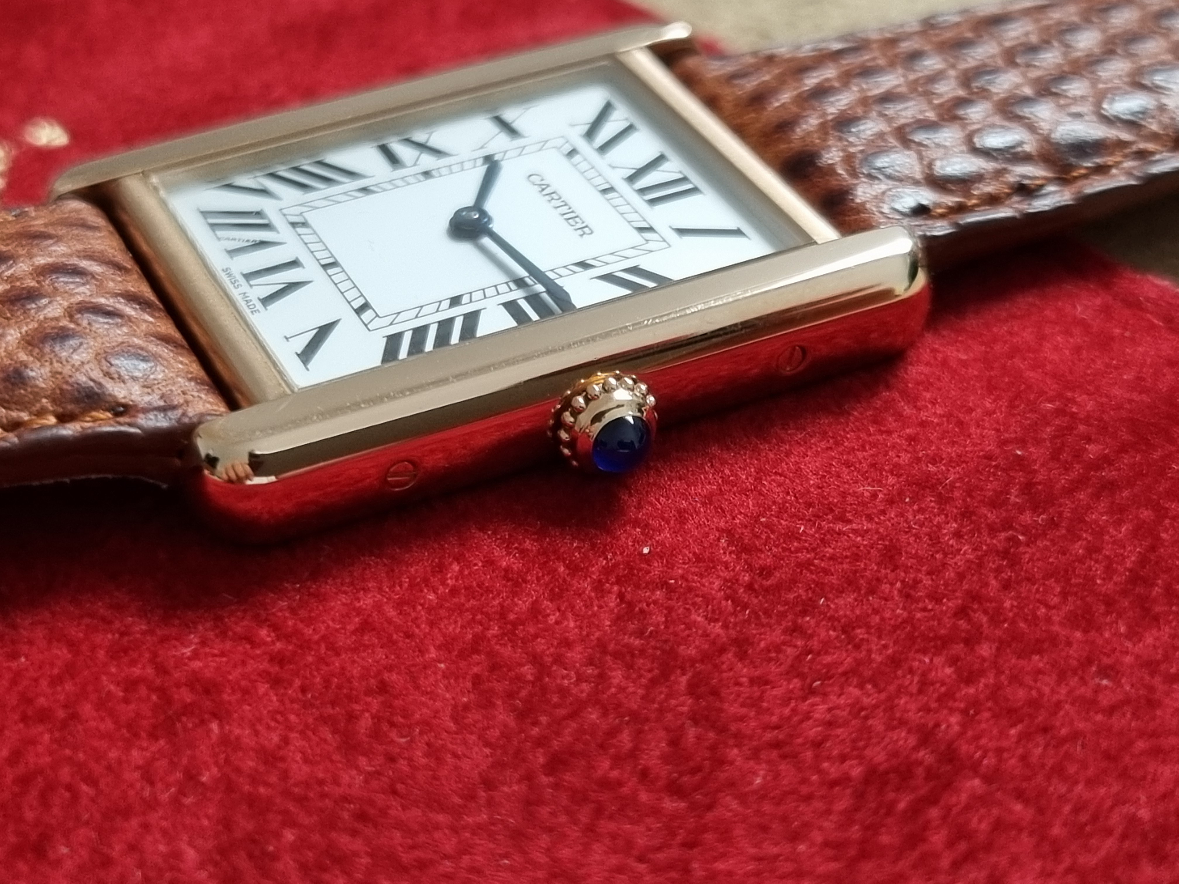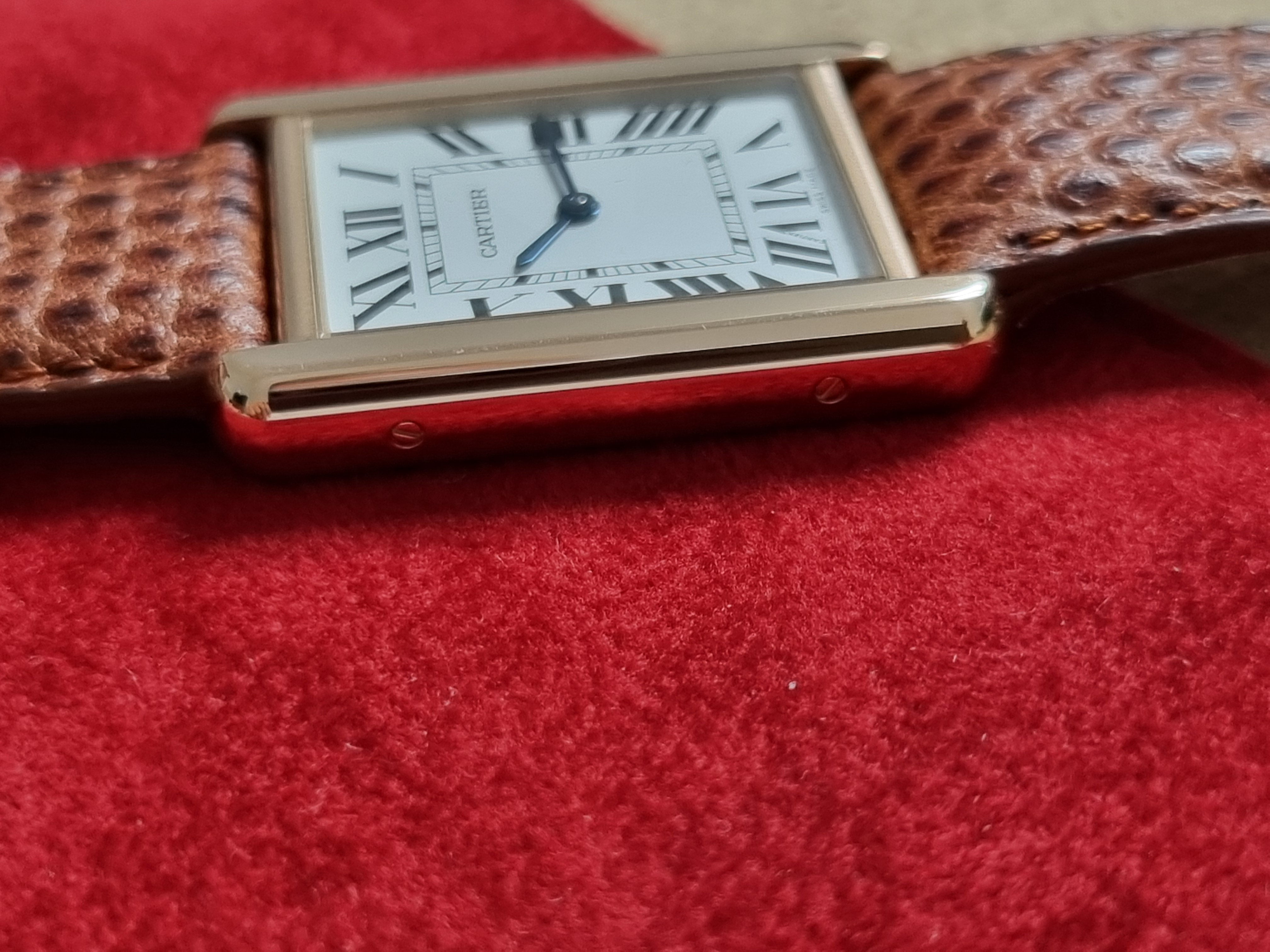 Cartier Tank Solo Large Steel And 18 Kt Rose Gold W5200025 - 3167 Mens Watch. Brand: CARTIER Model: Tank Solo Large Reference: 3167 Year: '2000s Movement: precision quartz-controlled; battery recently replaced Functions: hours, minutes Case: tank, 18K solid rose gold and steel Bezel: smooth Crown: knurled, with typical blue cabochon Lugs: straight; lug attachment 20 mm Dimensions: 27x28 mm excluding crown, 35 mm at the lugs Crystal: sapphire Case back: tightened by 4 screws, in steel, bearing the logo of the house Dial: white/silver, with Roman indexes, blued sword hands, central sextesimal scale in Chemin de fer, Cartier logo at 12 Strap: New generic leather brown Clasp: original Cartier, in 18 Kt rose gold The watch you see for sale is in excellent condition, it is perfectly functional, it is precise and reliable. It is completely original. No box no papers It is in the photo. Classy, fascinating!!!