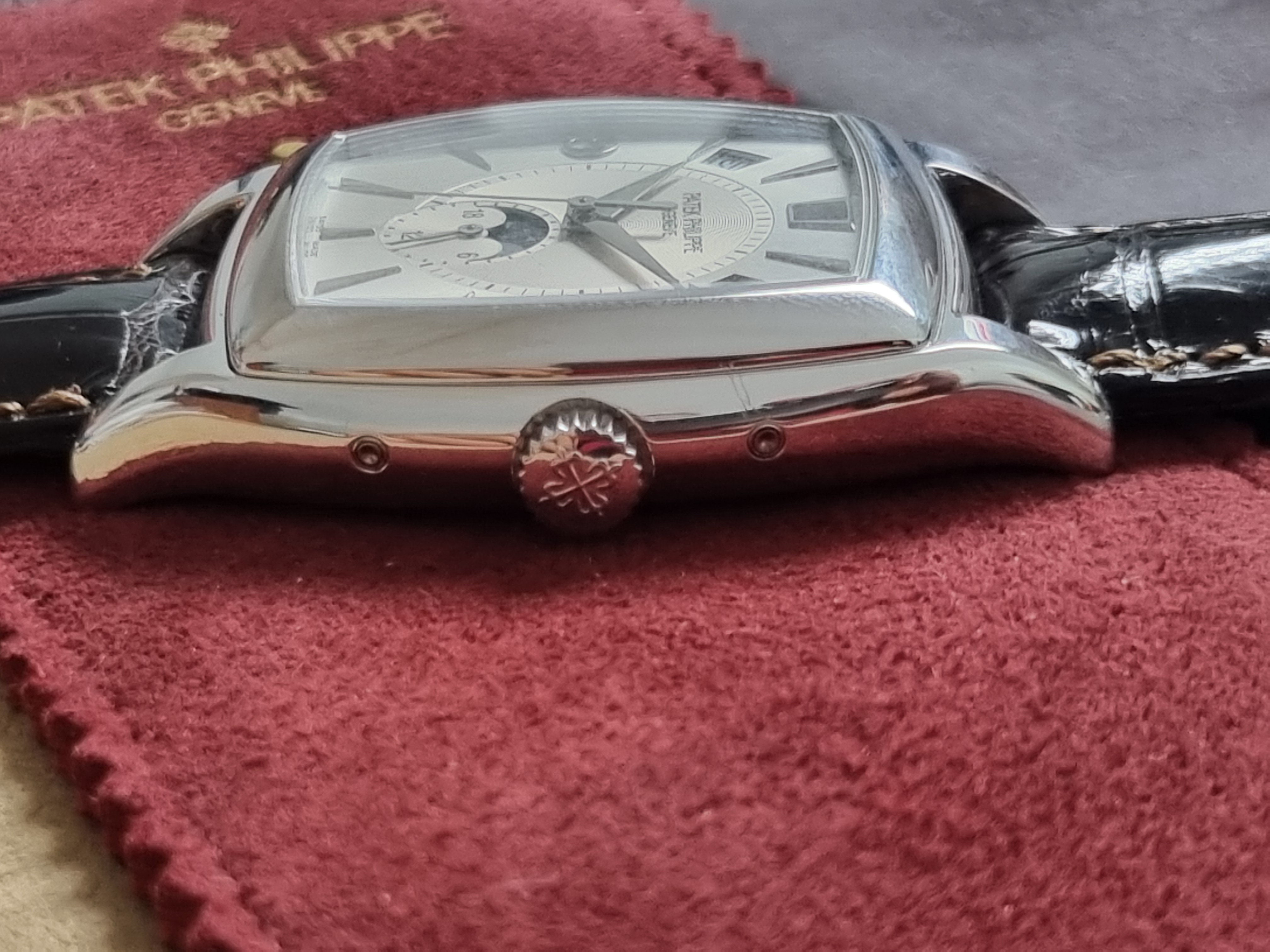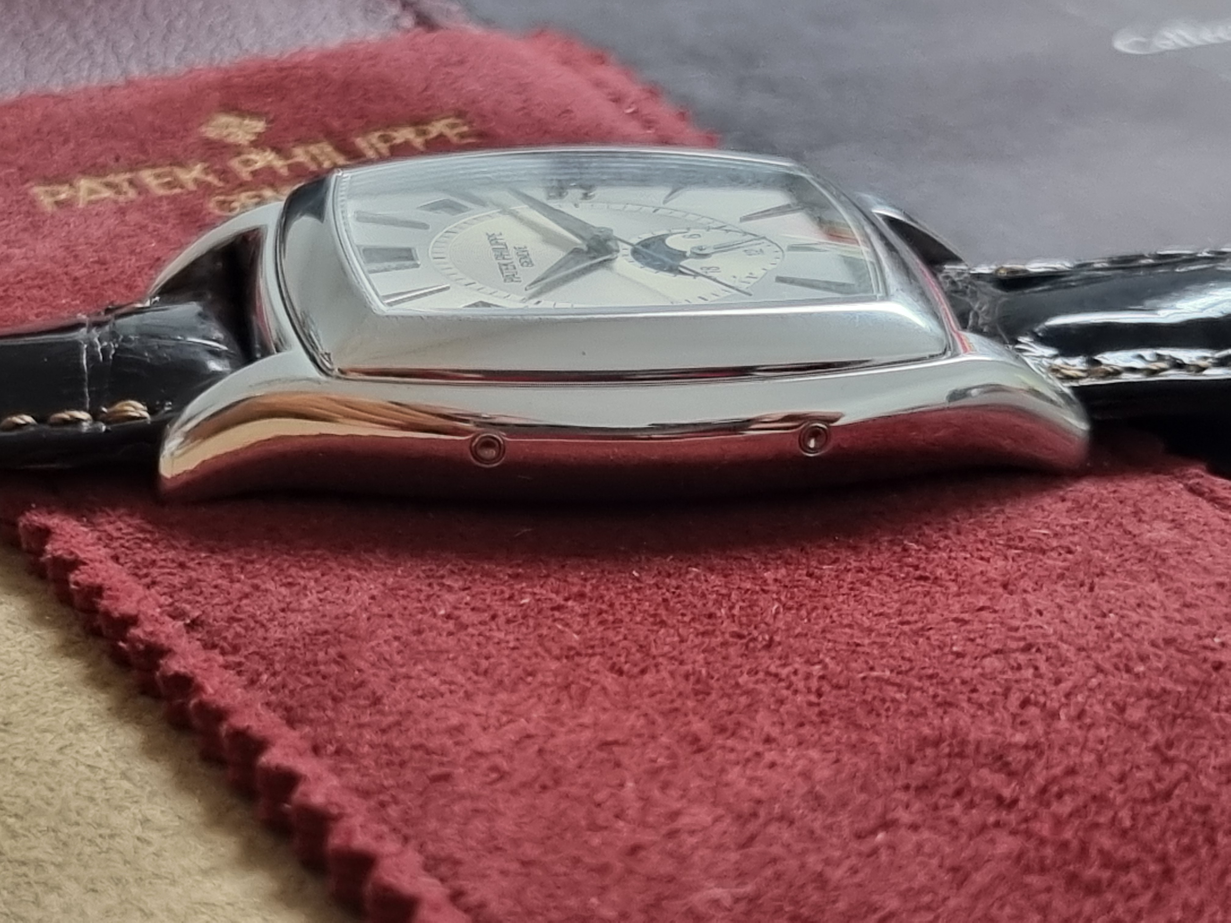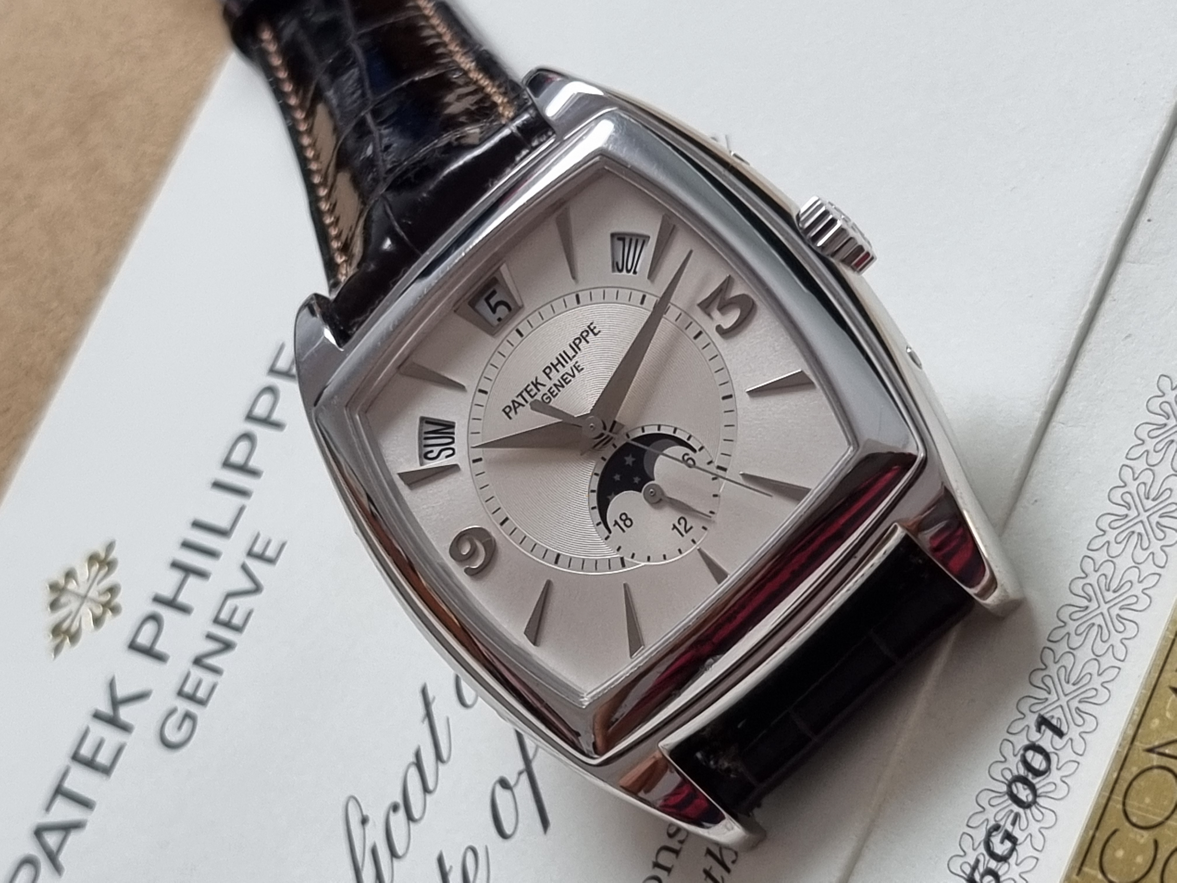 Patek Philippe Gondolo Complications 5135G-001 Mens Watch 38mm 18K white gold case - Papers And booklet In Leather Wallet With Suede Pouch - Year 2006. PATEK PHILIPPE. A FINE 18K WHITE GOLD AUTOMATIC TRIPLE CALENDAR WRISTWATCH WITH MOON PHASE Description : Model: Gondolo Calendario,Reference: 5135,Date: Sold in 2006,Movement: 34-jewel Cal.324/205 automatic, adjusted to heat, cold, isochronism & 5 positions, gold rotor, stamped with the Seal of Geneva,Dial: Silvered, applied polished dart hour markers, Arabic numeral 3 and 9, black inner minute divisions to engine turned centre, apertures at 10, 12 and 2 for day, date and month, moon phase indication at 6 combined with dual time zone, polished lance hands, centre seconds,Case: Polished tonneau form, screw down exhibition back, quick set buttons at 2, 4, 8 and 10,Strap/Bracelet: Brown alligator leather, hand made in Italy ,Buckle/Clasp: 18K white gold buckle, signed,Signed: Case, dial, and movement,Size: 38mm,Accompaniments: Patek warranty paper , booklets and leather wallet and leather suede pouch ( see pics) .