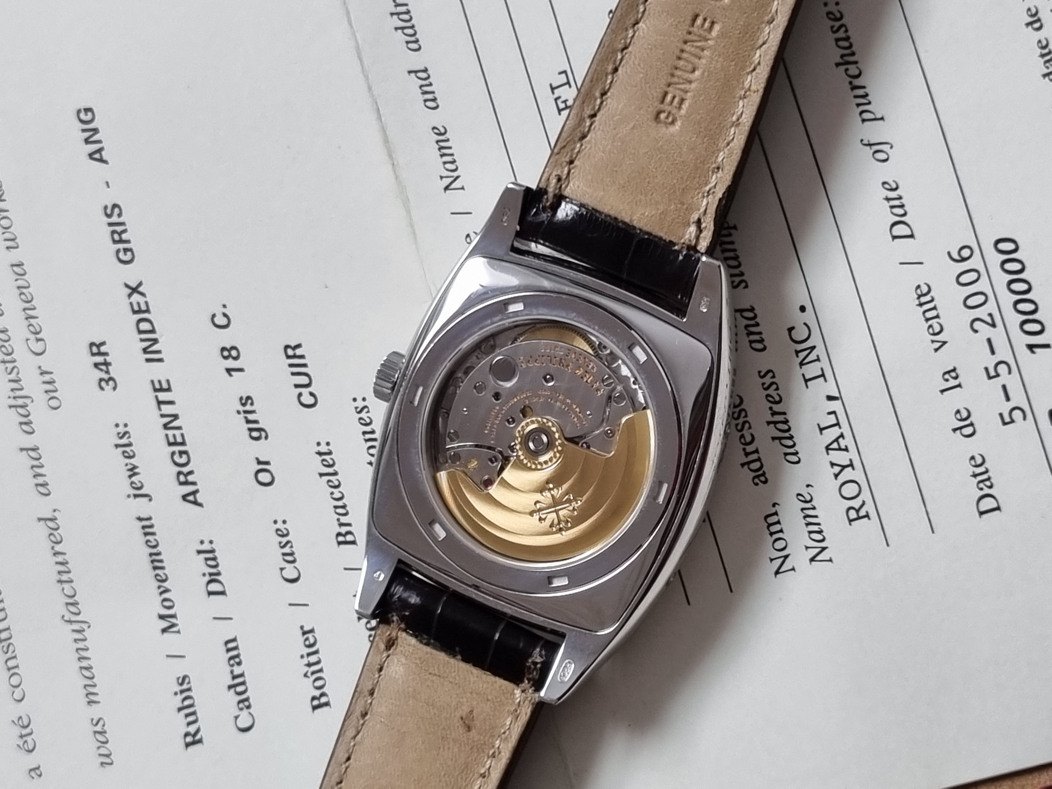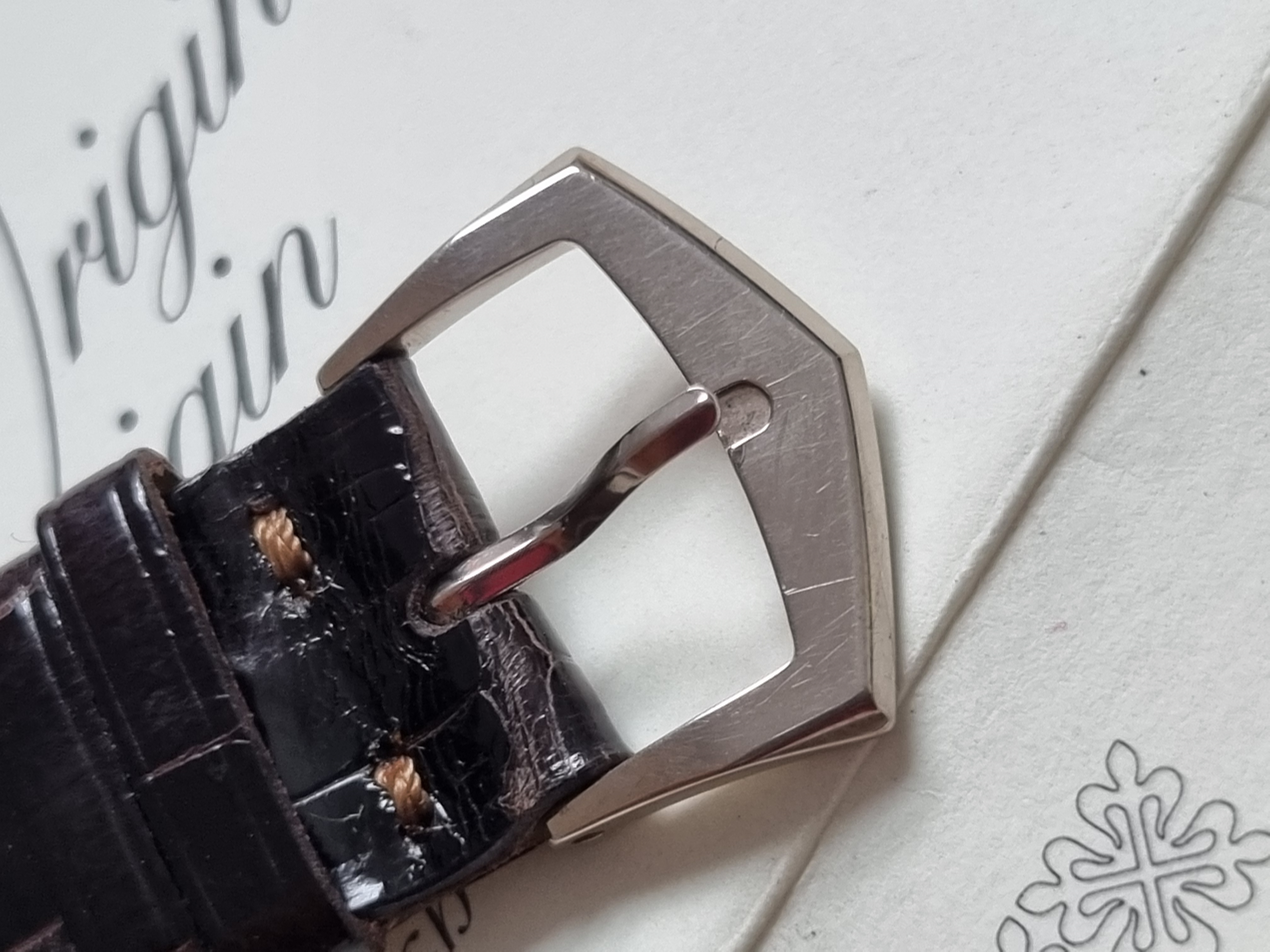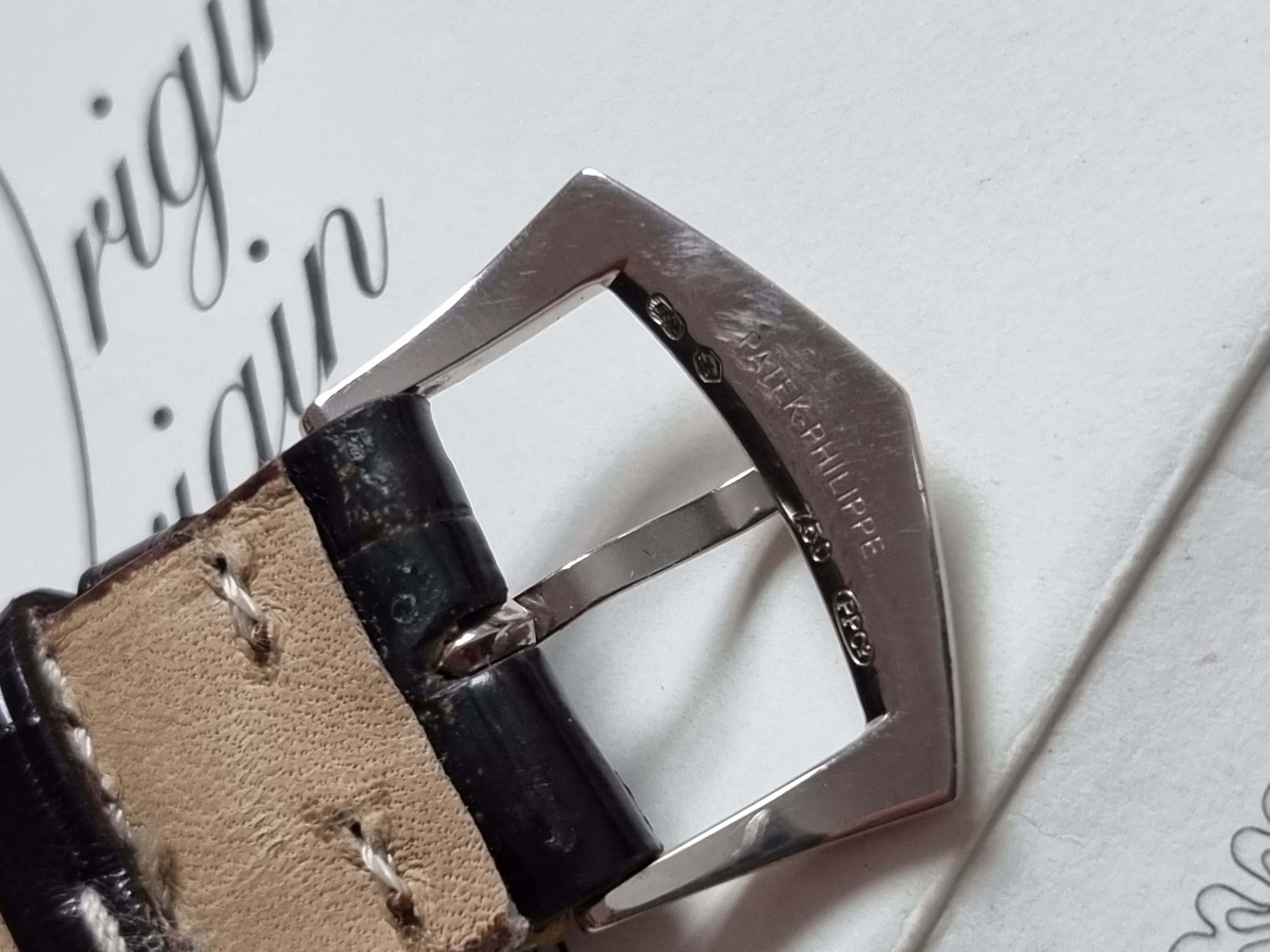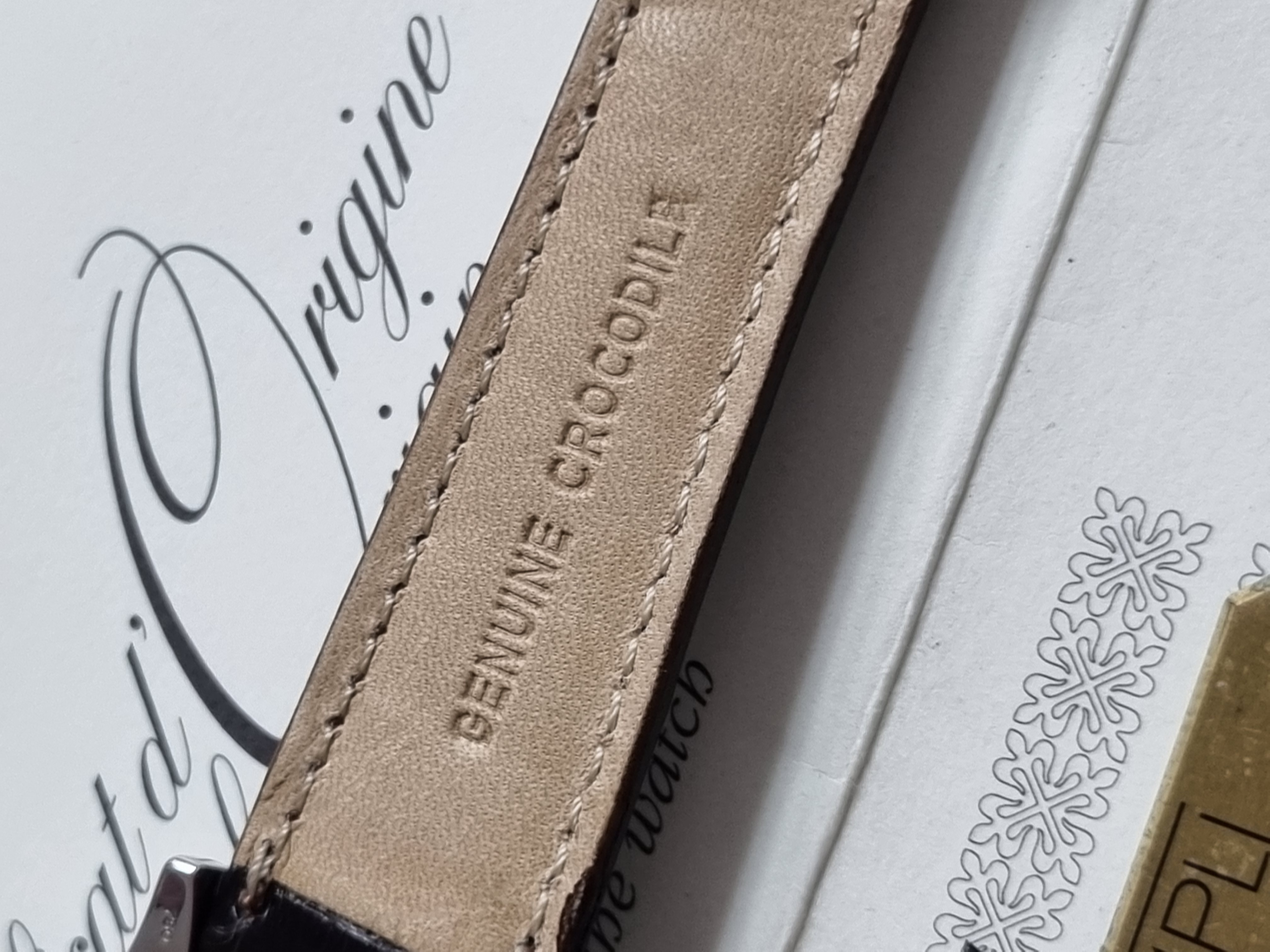 Patek Philippe Gondolo Complications 5135G-001 Mens Watch 38mm 18K white gold case - Papers And booklet In Leather Wallet With Suede Pouch - Year 2006. PATEK PHILIPPE. A FINE 18K WHITE GOLD AUTOMATIC TRIPLE CALENDAR WRISTWATCH WITH MOON PHASE Description : Model: Gondolo Calendario,Reference: 5135,Date: Sold in 2006,Movement: 34-jewel Cal.324/205 automatic, adjusted to heat, cold, isochronism & 5 positions, gold rotor, stamped with the Seal of Geneva,Dial: Silvered, applied polished dart hour markers, Arabic numeral 3 and 9, black inner minute divisions to engine turned centre, apertures at 10, 12 and 2 for day, date and month, moon phase indication at 6 combined with dual time zone, polished lance hands, centre seconds,Case: Polished tonneau form, screw down exhibition back, quick set buttons at 2, 4, 8 and 10,Strap/Bracelet: Brown alligator leather, hand made in Italy ,Buckle/Clasp: 18K white gold buckle, signed,Signed: Case, dial, and movement,Size: 38mm,Accompaniments: Patek warranty paper , booklets and leather wallet and leather suede pouch ( see pics) .