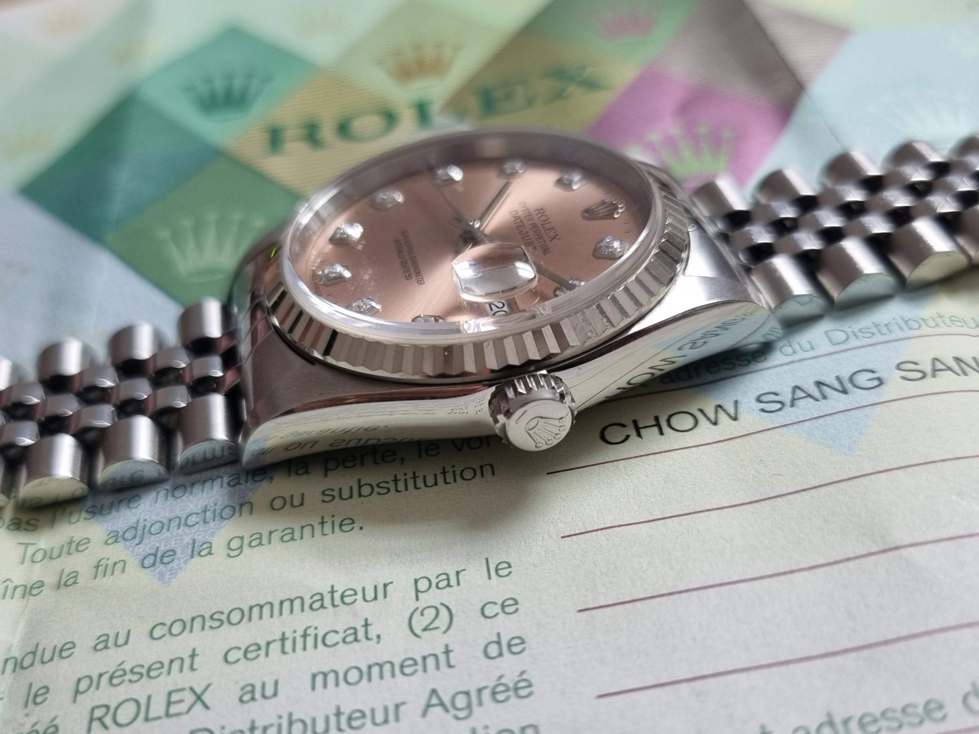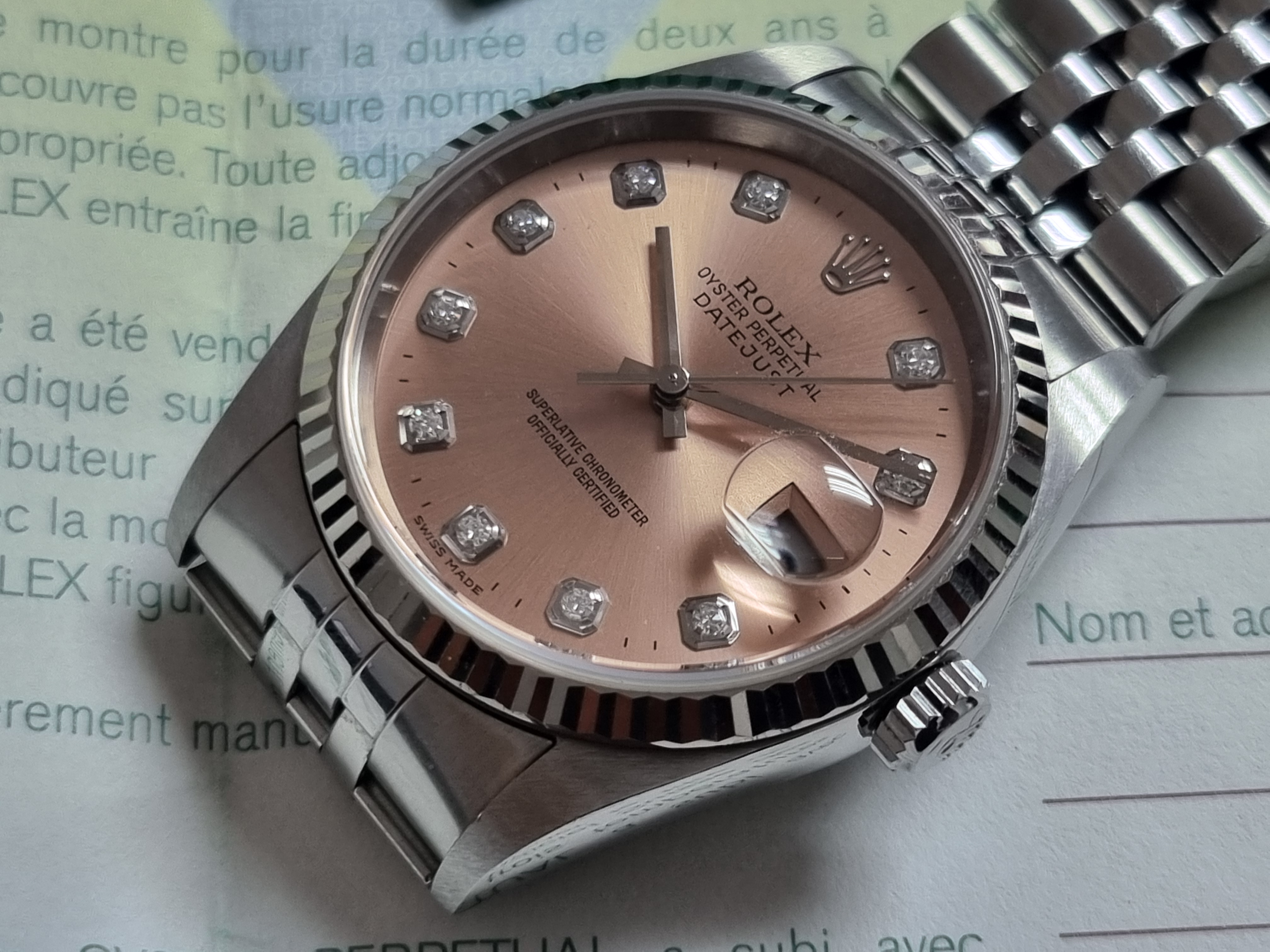 Rolex Datejust Datejust 36 16234 Factory Salmon Diamond Dial Steel And 18Kt WG Bezel Jubilee Paper 2006