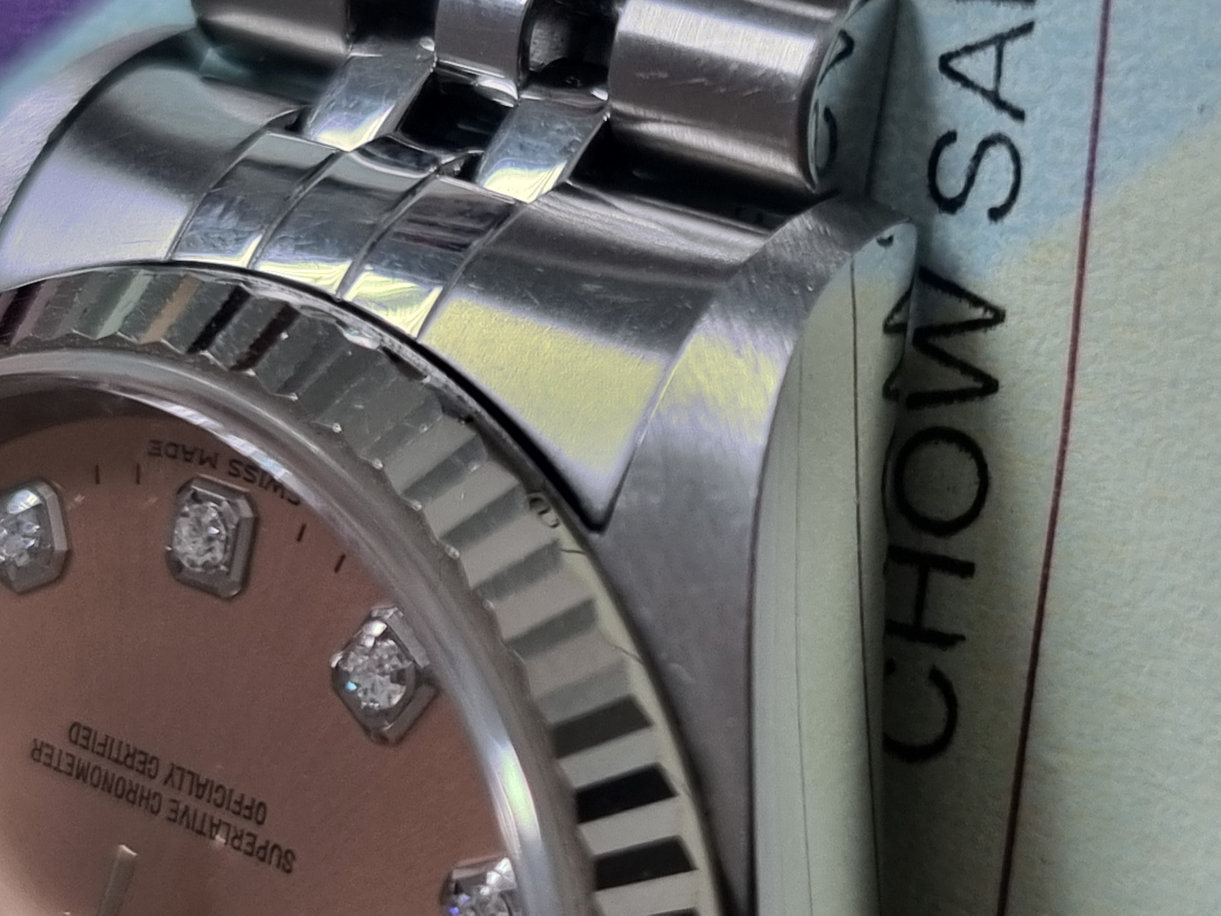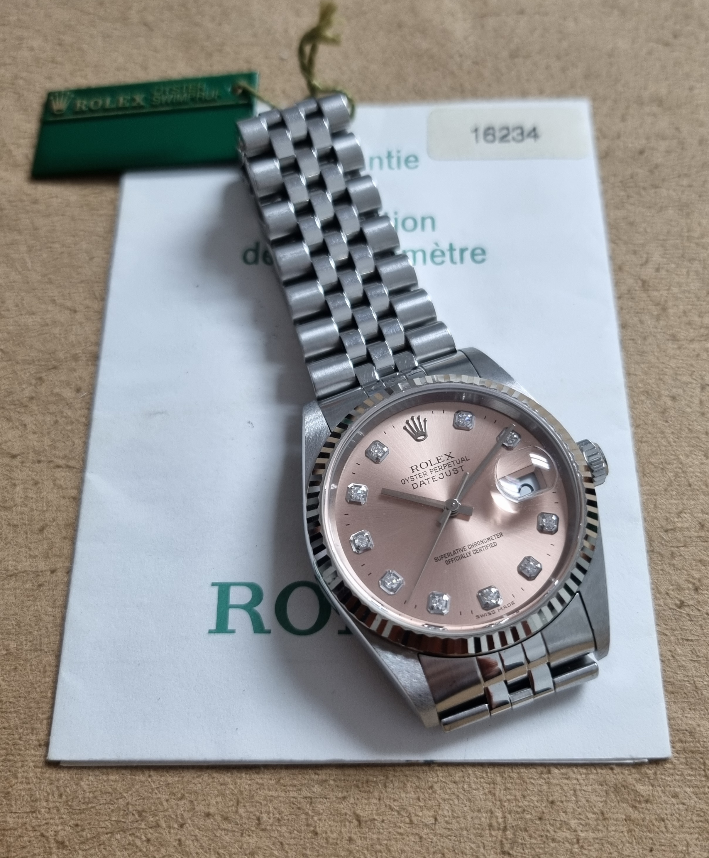 Rolex Datejust 36 ref. 16234 Factory Salmon Diamond Dial Stainless Steel And 18KT WG Bezel Jubilee Bracelet With Paper 2006. Style Number: 16234 Serial: F08* Year: 2006 Model: Rolex Datejust Case Material: Stainless Steel Band: Jubilee Stainless Steel with n. 20 links Bezel: 18k White Gold Fluted Dial: Factory Salmon Pink Diamond Dial Crystal: Sapphire Case Size: 36mm - sticker on caseback as pics Box: No Paper: Rolex warranty paper 2006 Tag green plastic with serial number as pics.
