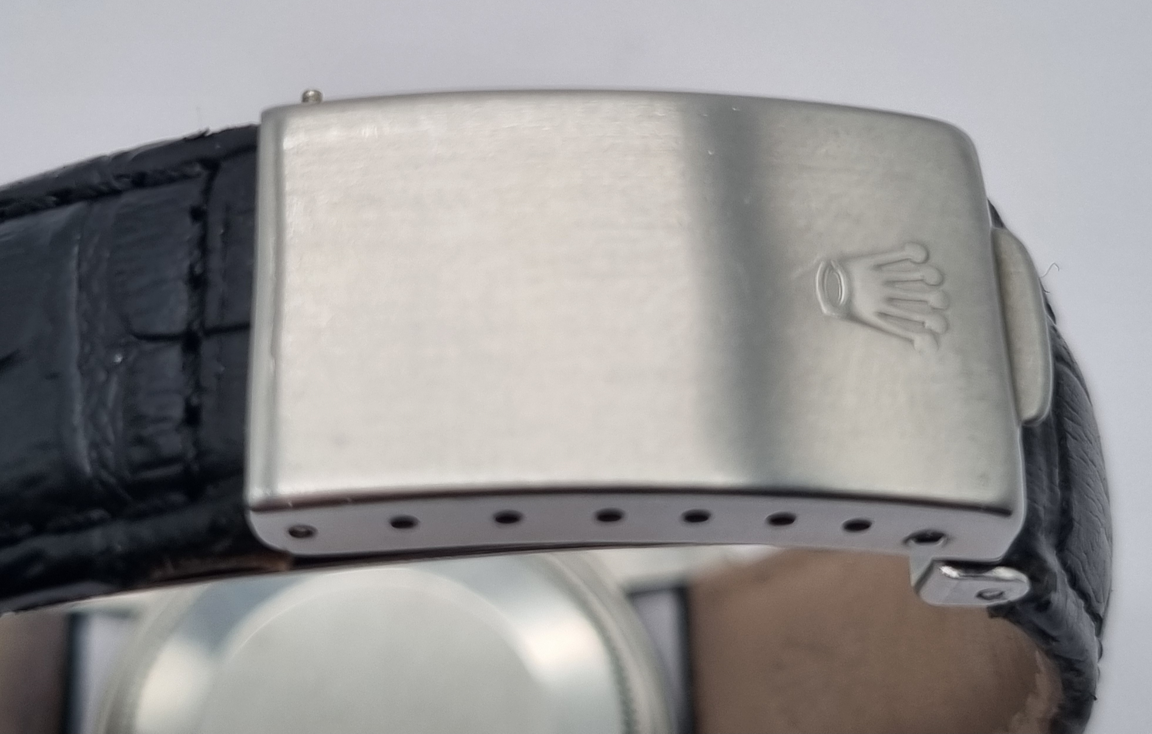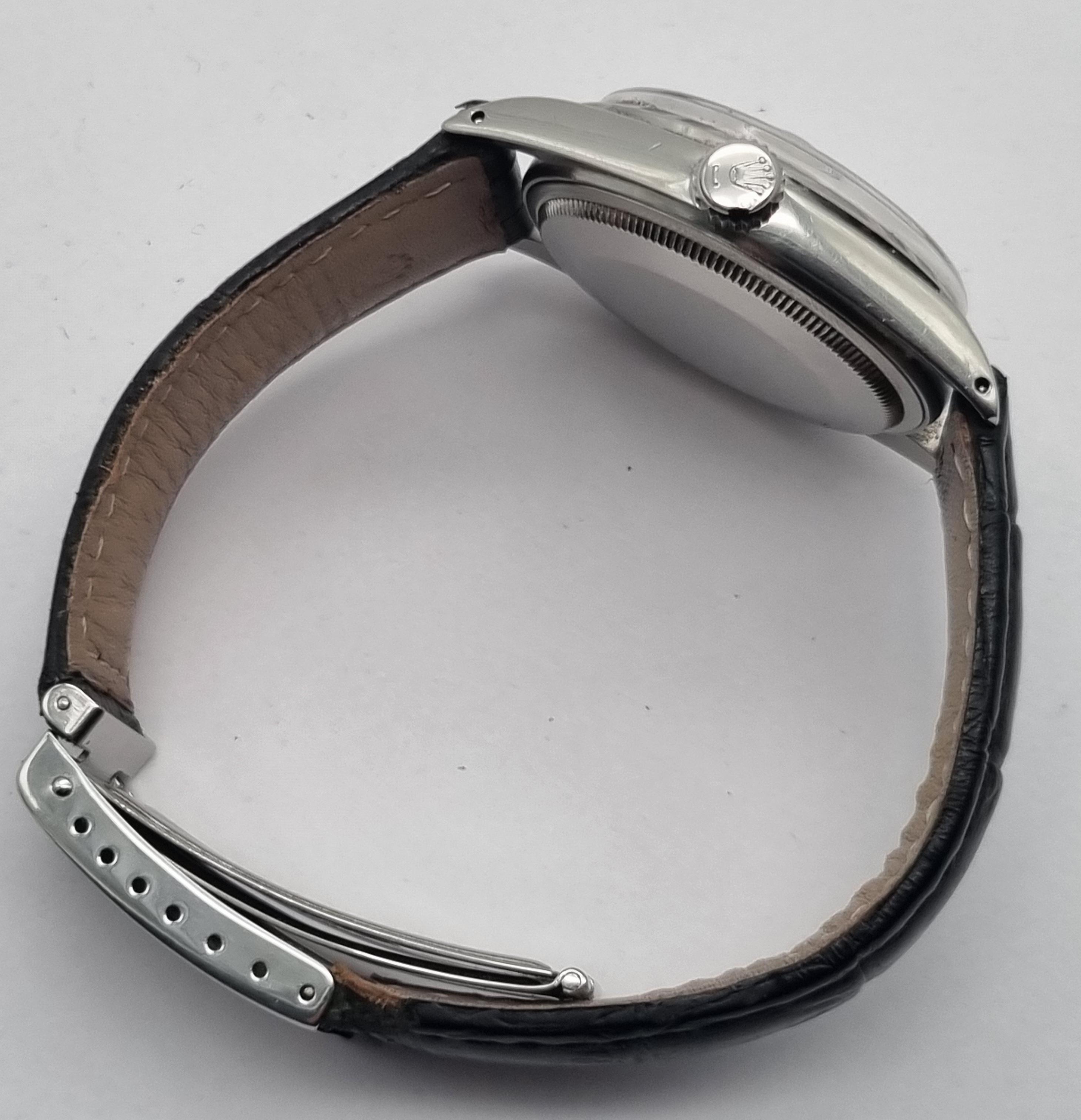 Rolex Datejust 36 Steel Ref. 1600 Smooth Bezel Silver Dial Caliber 1570 Leather Deployant. Brand: Rolex Model: Datejust Reference Number: 1600 Gender: Mens Metal: Steel Case Size: 36mm - plexi glass Caliber : 1570 Dial: Silver pie pan Bezel: Smooth Band: Leather black strap with clasp 62510H Code F Box: No box Papers: No papers Year : 1969 Condition: Good condition as pics No box no papers