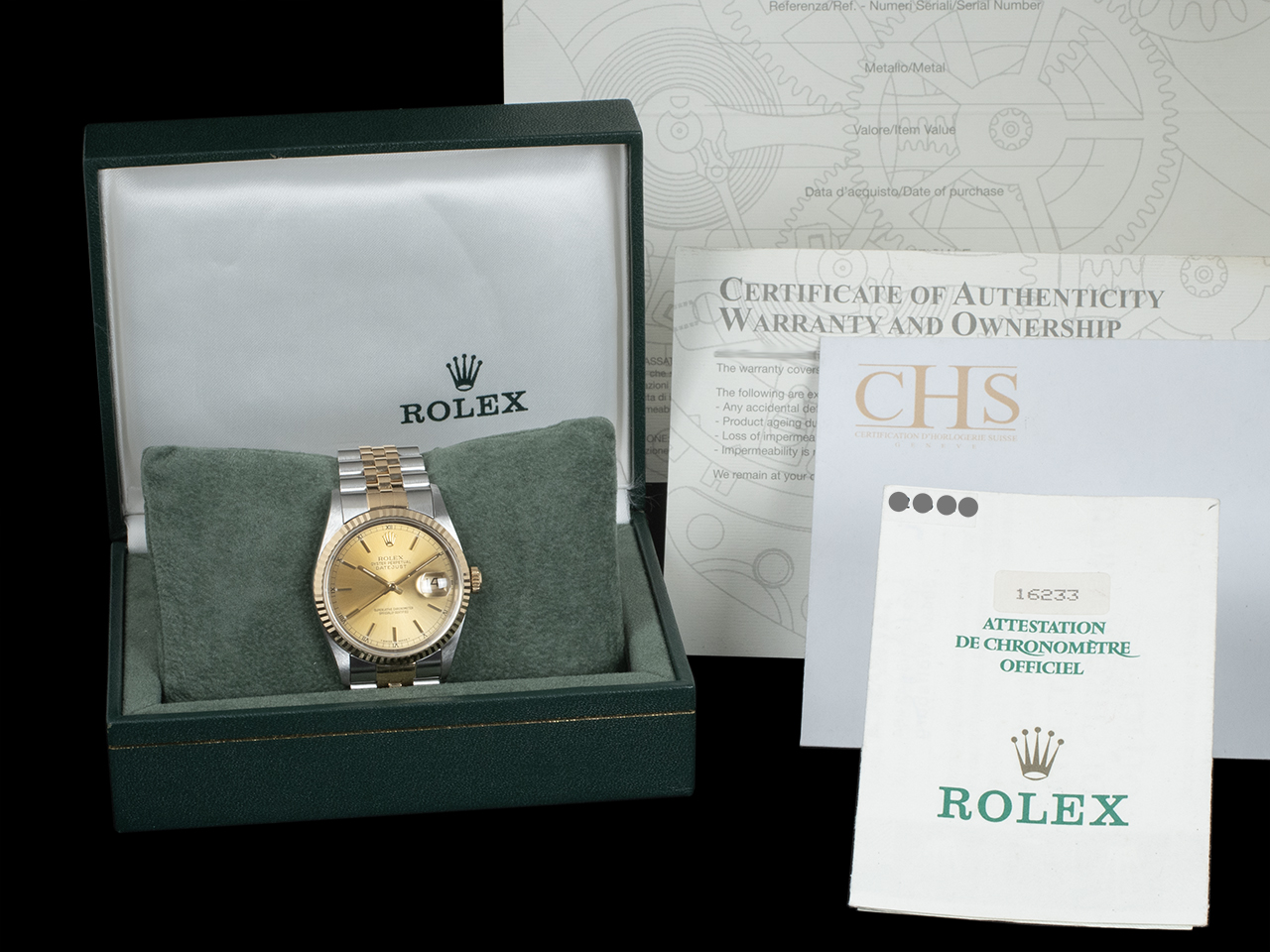 R1264 Rolex Datejust 36 Champagne Jubilee 16233 Crissy Rolex Datejust - Ref. 16233 Crissy Cassa 36mm in acciaio e oro 18kt con vetro zaffiro Quadrante champagne Bracciale Jubilé in acciaio e oro 18kt Movimento automatico Anno di vendita: 1996 Eccellenti condizioni Garanzia Rolex Prodotto finanziabile a rate >> informazioni Compreso nel Prezzo dell'orologio: ♛ Scatola Rolex ♛ Certificato CHS, Registrazione delle Matricole a livello Internazionale del valore di 195,00 CHF (Franchi Svizzeri) pari a 188,00 euro ♛ Certificato di Autenticità Fotografico delle parti meccaniche dell'orologio, redatto dal Perito del Tribunale di Bologna iscrizione 1033, del valore di 200,00 € ♛ Perizia/Expertise e Garanzia "della Rocca 5 anni rinnovabile" >> informazioni Le Foto dell'orologio pubblicate in questa scheda sono state fatte nel nostro studio fotografico interno e sono quelle originali del Rolex Datejust 16233 sopra descritto. Nella foto, l'orologio è accompagnato da una scatola originale Rolex mostrata a scopo dimostrativo. Modello, dimensioni e colore della scatola potrebbero variare.