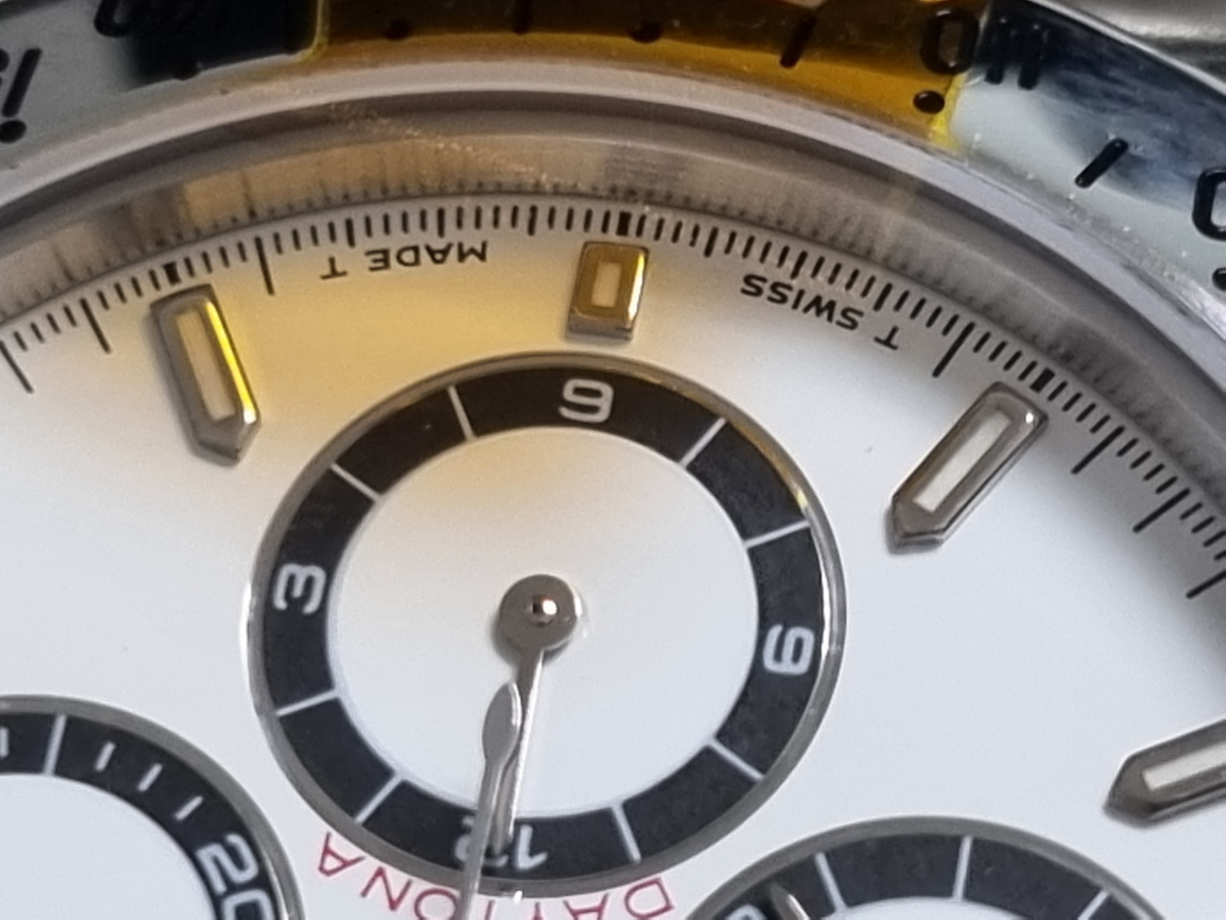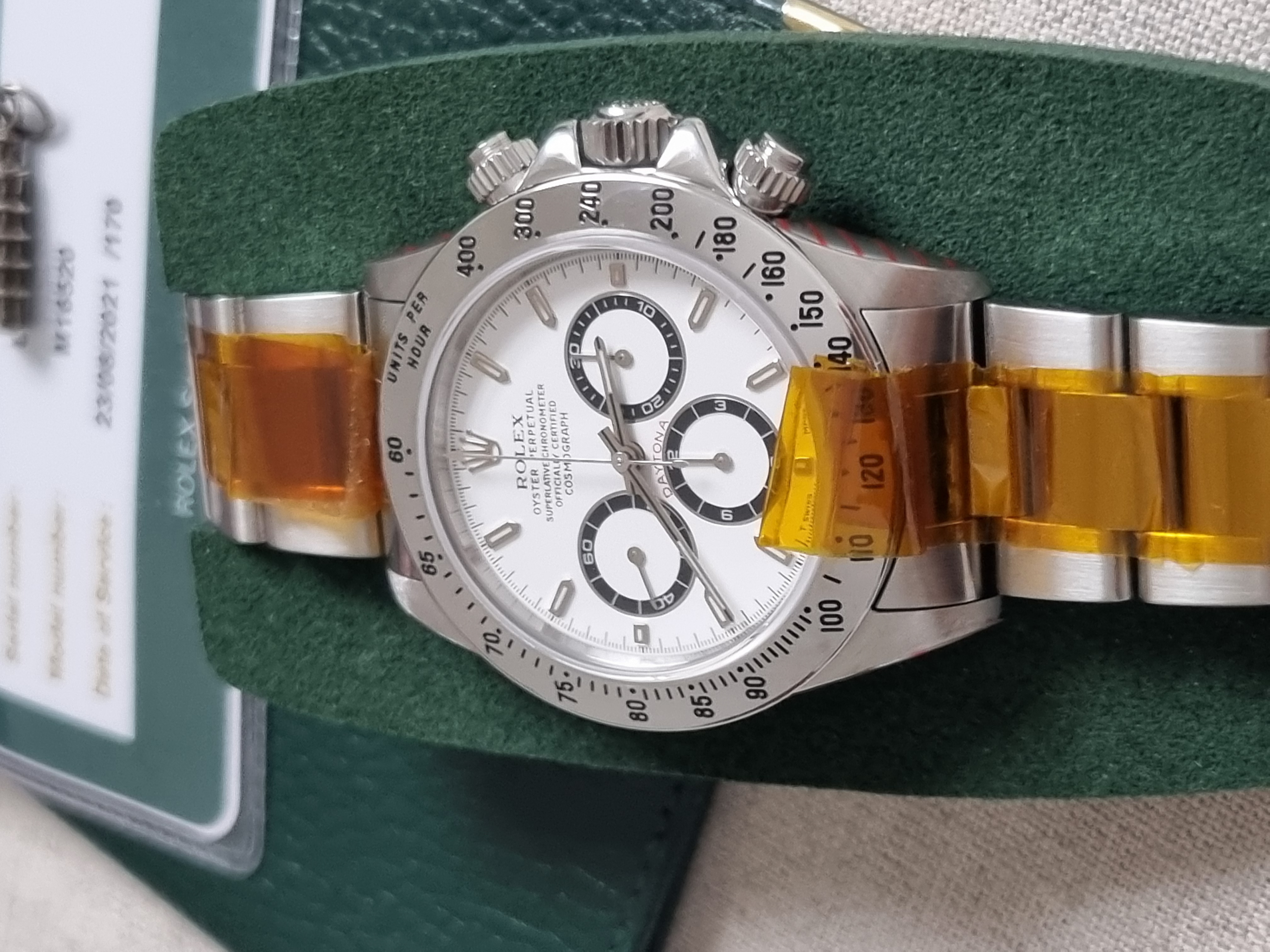 Rolex Daytona Steel 40 Mm White Dial Zenith Movement 16520 U Serial 1997 Service 2021 no paper only Rolex service 08-2021. N. B. : The watch in question underwent a full service at Rolex in Italy in August 2021 and has been preserved since then as it was collected. It therefore has all the films applied and the crown protection from the service, as shown in the photos. Not Have original warranty Rolex but have the service obviously performed at Rolex in August 2021. Rolex Cosmograph Daytona ref. 16520, steel 40 mm , produced in 1998. Three-piece case, screw-down case back, graduated bezel. White dial, black graphics, applied indexes, baton hands. Cal. 4030 movement, three-counter chronograph, automatic, stopwatch. Steel Oyster bracelet with flip-lock clasp and 13 links. Condition as pics. Paper : No. Box : No Only Rolex green leather pochette as pics.