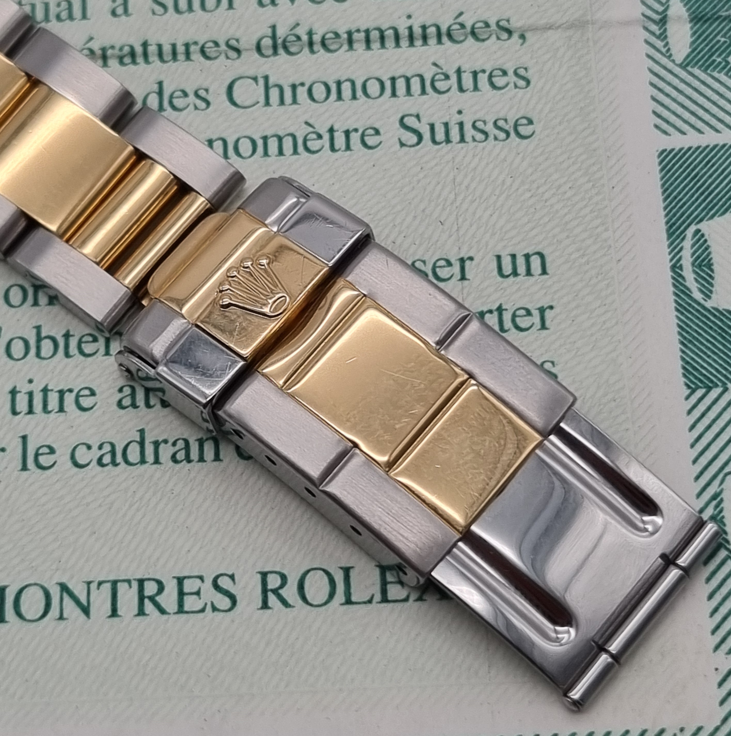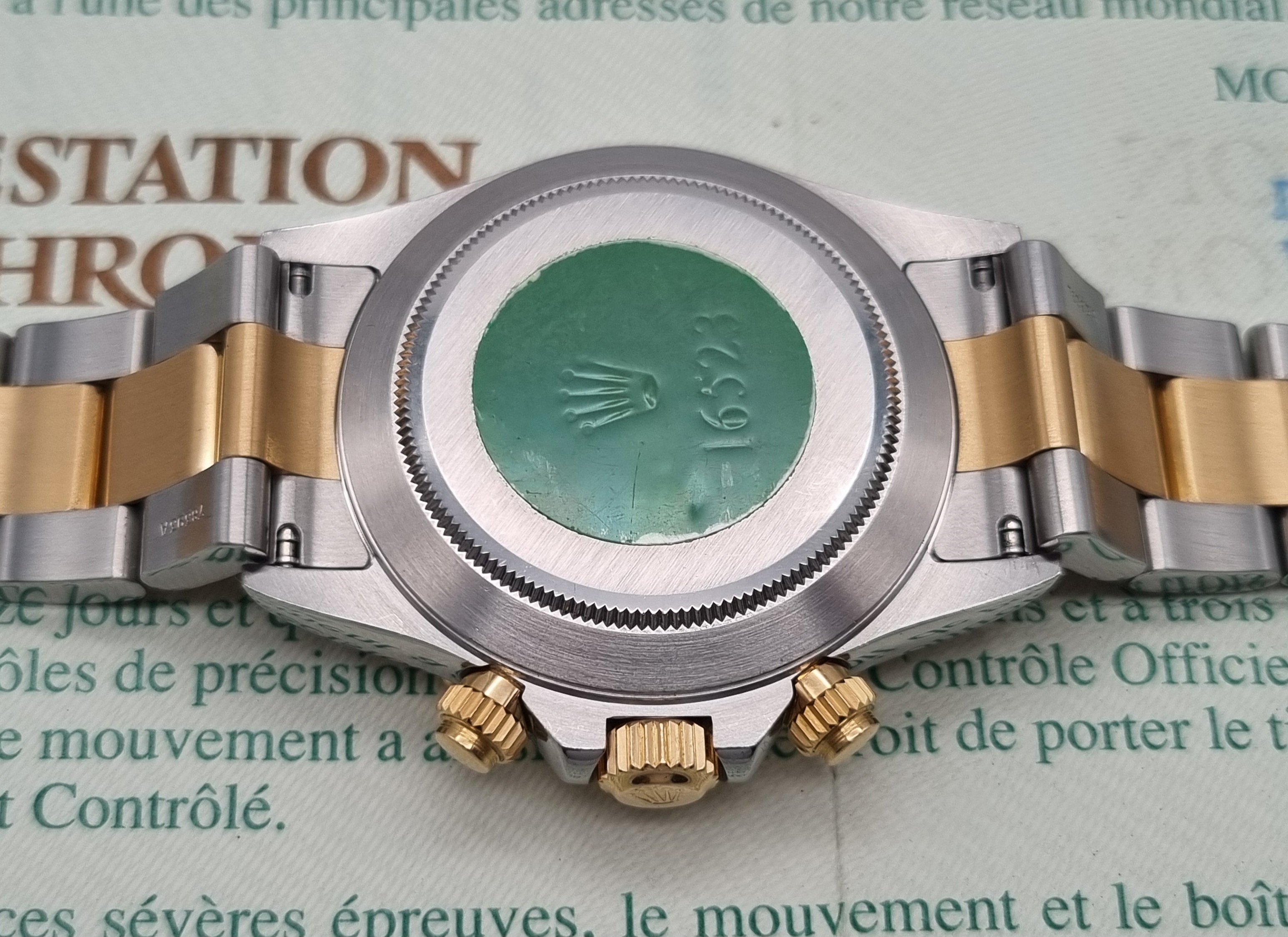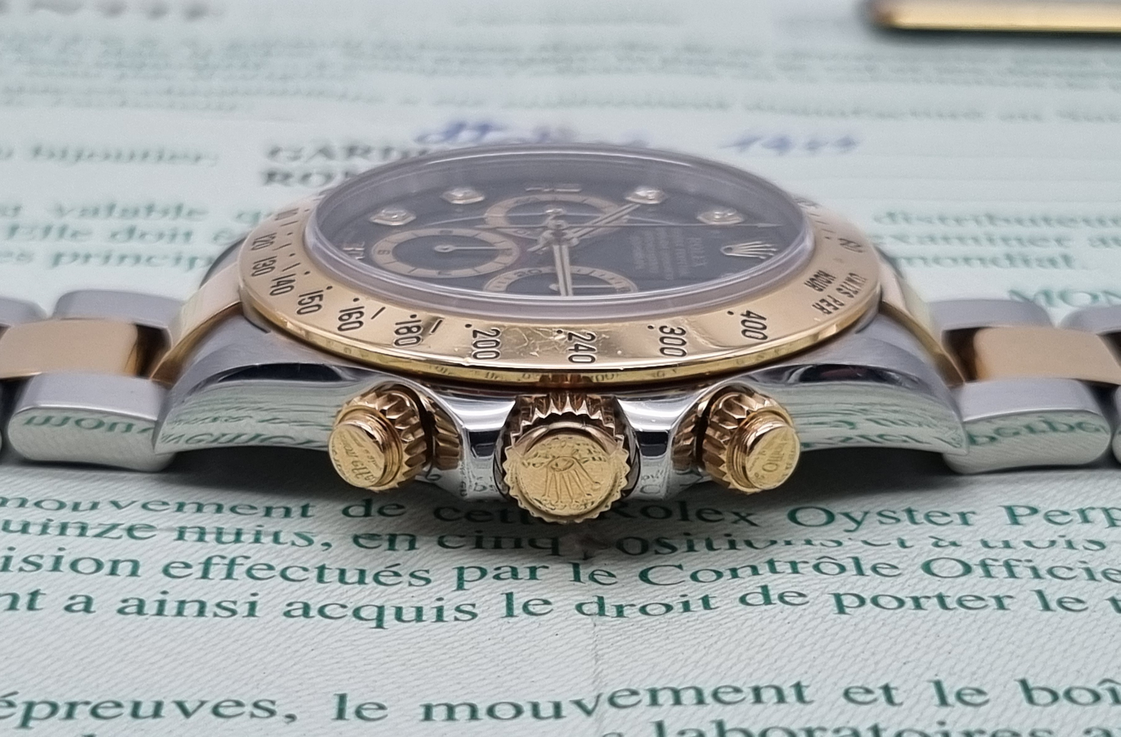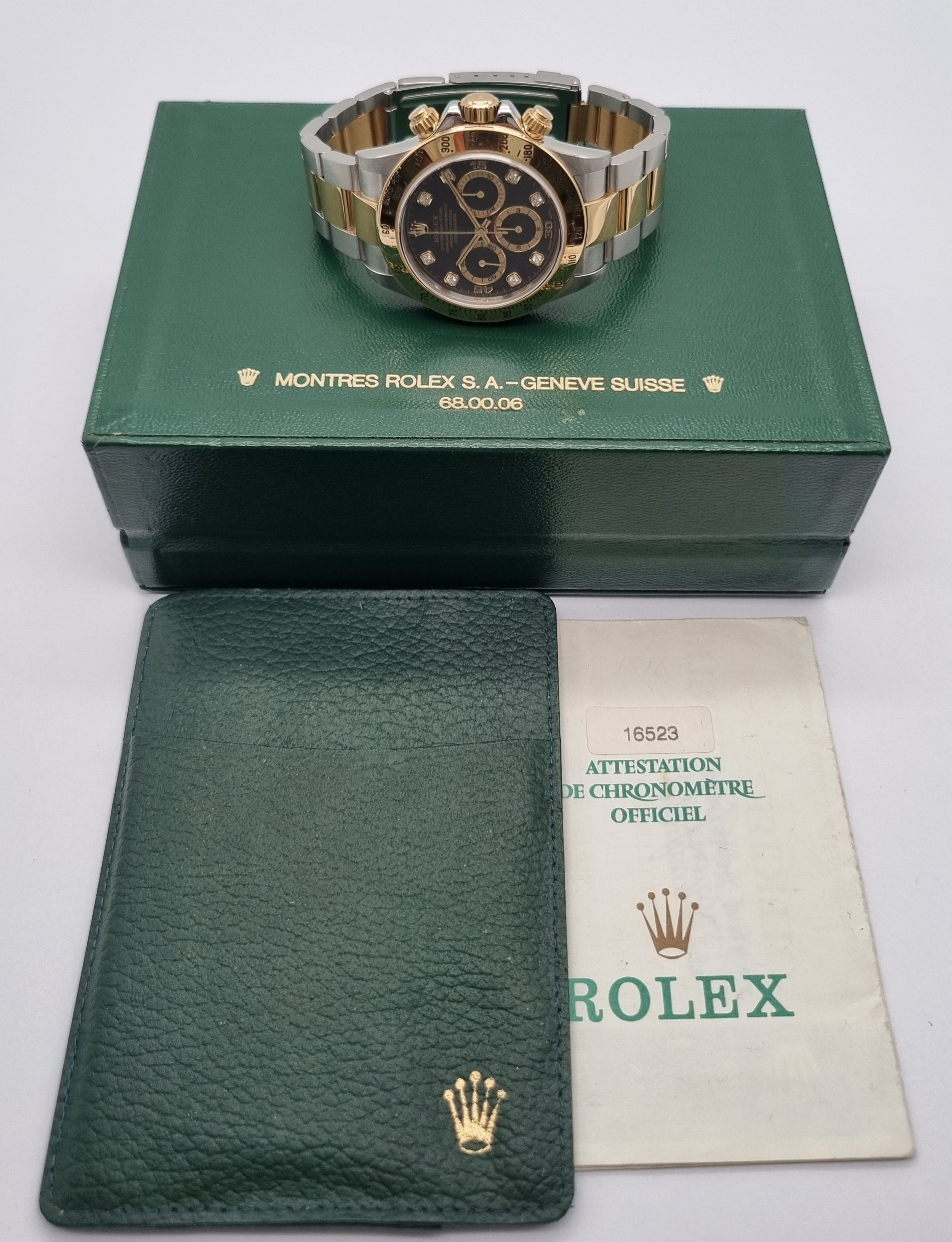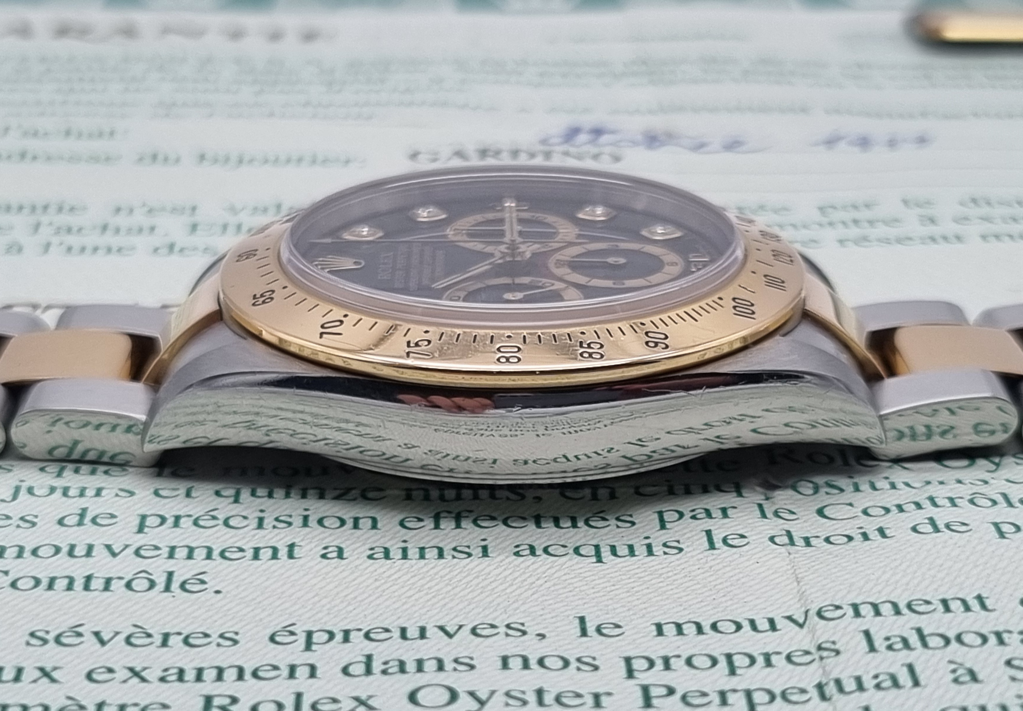 Rolex Daytona A-Serial (Last-Serial) 16523 Steel And 18 Kt Yellow Gold Back Diamonds Dial Box And Papers 1999. Brand : Rolex (Guaranteed Authentic) Model : Daytona Cosmograph Reference Number : 16523 Serial Number : A Gender : Men's Metal : Two-Tone (Yellow Gold 18 Kt /Stainless Steel) Case Size : 40.00 mm Movement : Rolex Cal. 4030 Swiss Automatic Movement with a chronograph function Crystal : Rolex Scratch-Resistant Sapphire Crystal Dial : Rolex Black Dial with Diamonds indexes Bezel : Rolex Yellow Gold Bezel with an engraved tachymetric scale in good condition Band : Rolex Two-Tone Link Oyster Bracelet with a Flip Lock Deployment Clasp With N. 12 Links Box : Yes, this item includes the Rolex Watch Box Papers : This item includes Rolex warranty signed and stamped Italian Dealer year 1999 Condition : This item is in good condition as pics.