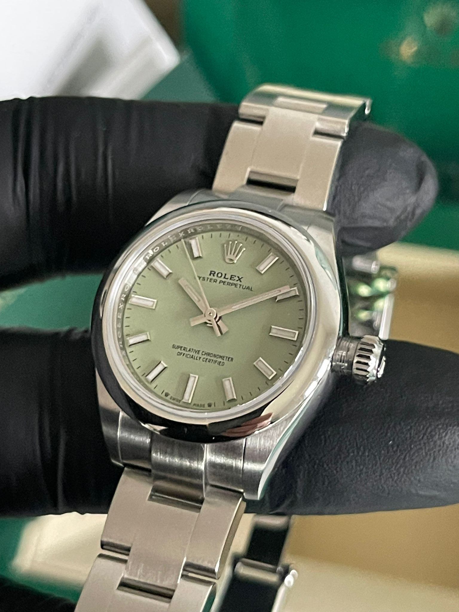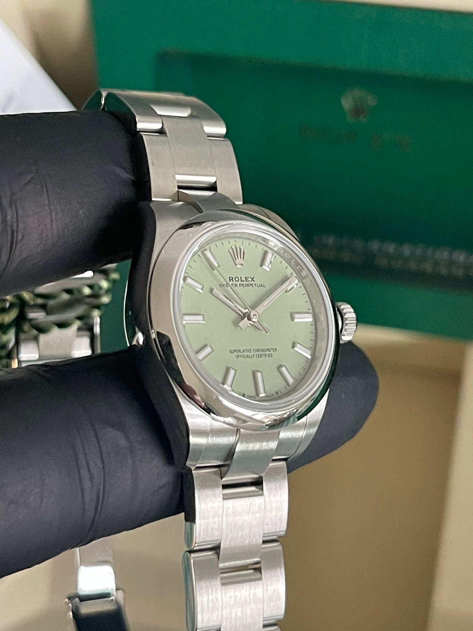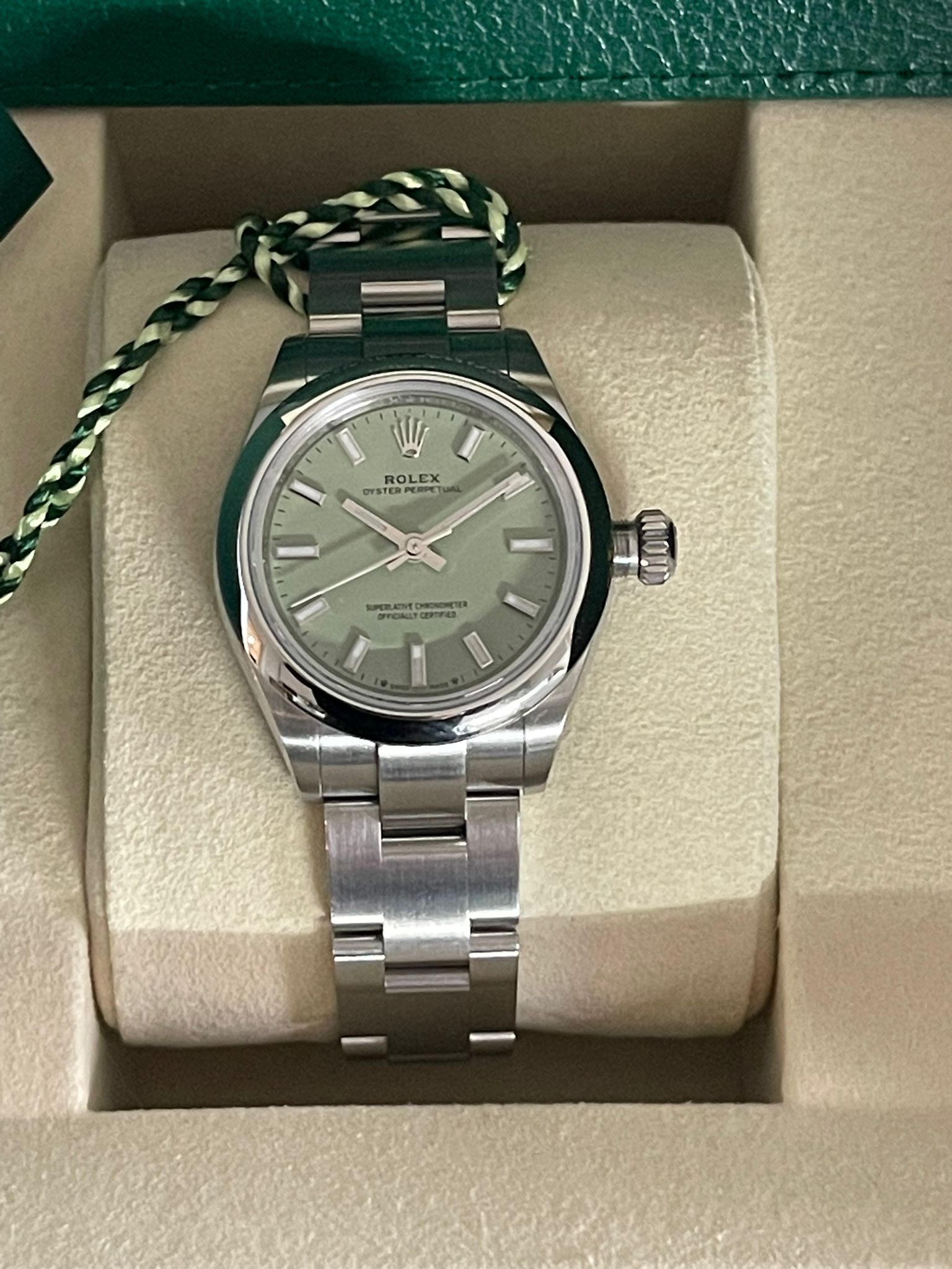 Rolex Oyster Perpetual 28 276200 Oyster Perpetual 28 Smooth Bezel Steel Pistachio Green Dial Oyster New Full 12-2025. This watch is Unworn and comes complete with the original box, booklets, green tag, and warranty card. Specifications MODEL CASE: Oyster, 28 mm, Oystersteel OYSTER ARCHITECTURE: Monobloc middle case, screw-down case back and winding crown DIAMETER: 28 mm MATERIAL: Oystersteel BEZEL: Domed WINDING CROWN: Screw-down, Twinlock double waterproofness system CRYSTAL: Scratch-resistant sapphire WATER RESISTANCE: Waterproof to 100 metres / 330 feet MOVEMENT: Perpetual, mechanical, self-winding CALIBRE: 2232, Manufacture Rolex FUNCTIONS: Centre hour, minute and seconds hands. Stop-seconds for precise time setting WINDING: Bidirectional self-winding via Perpetual rotor POWER RESERVE: Approximately 55 hours BRACELET: Oyster, flat three-piece links BRACELET MATERIAL: Oystersteel CLASP: Folding Oysterclasp with Easylink 5 mm comfort extension link DIAL: Pistachio