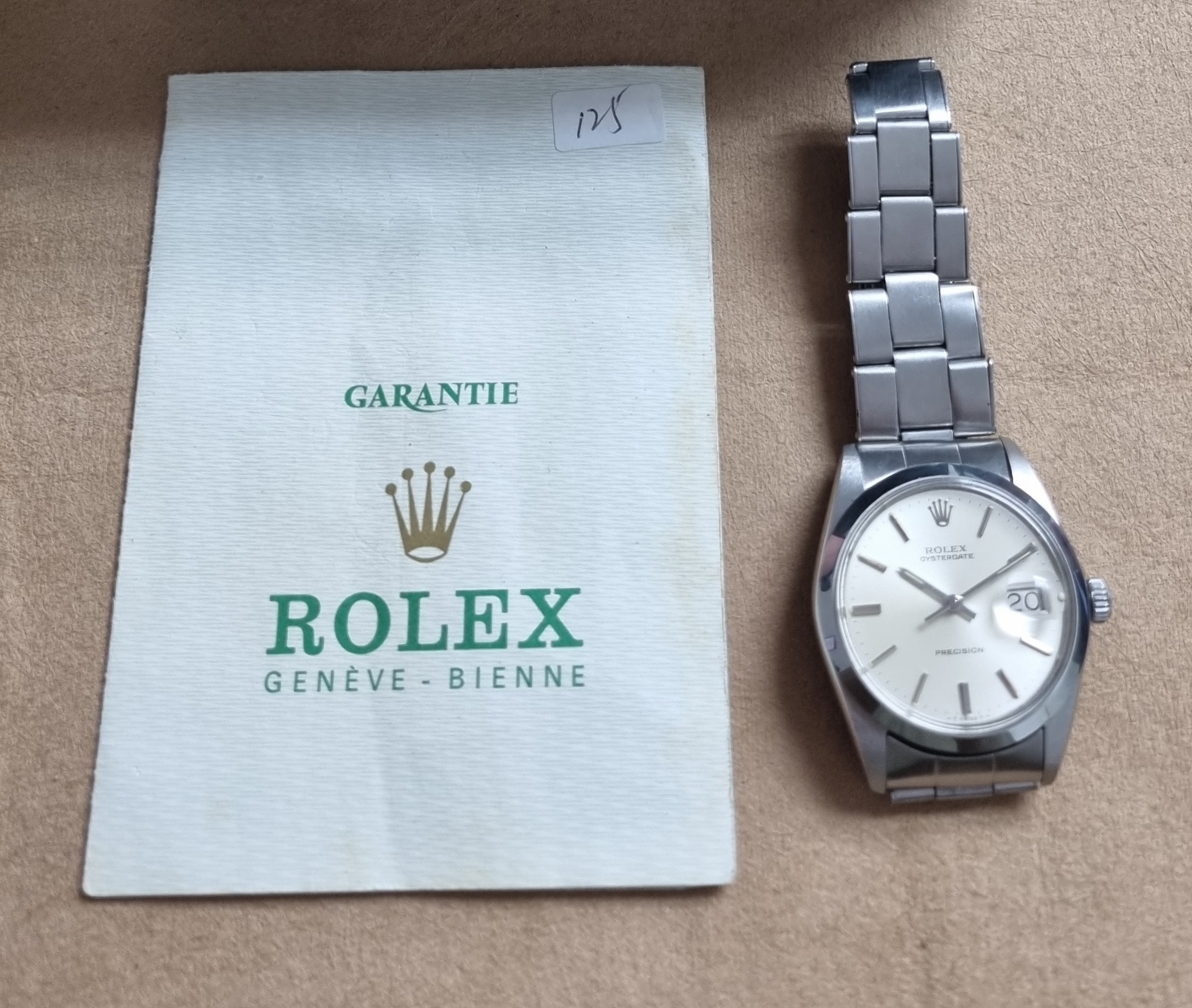 Rolex Oysterdate Precision Oyster Date 6694 Steel Mm 34 Silver Dial Oyster Expandable Manual Winding Warranty 1973. Stainless steel case mm 34 - plexi glass. Silver dial - date. Manual winding caliber 1225. Bracelet oyster expandable clasp tiny logo signed 1958 with n. 12 links. Warranty paper signed and stamped 1975. No box. General good condition as pics. 100 % Original. N. B. : The watch will come with Rolex 4447844.8064 Pochette watch green fabric for watch collection genuine new.