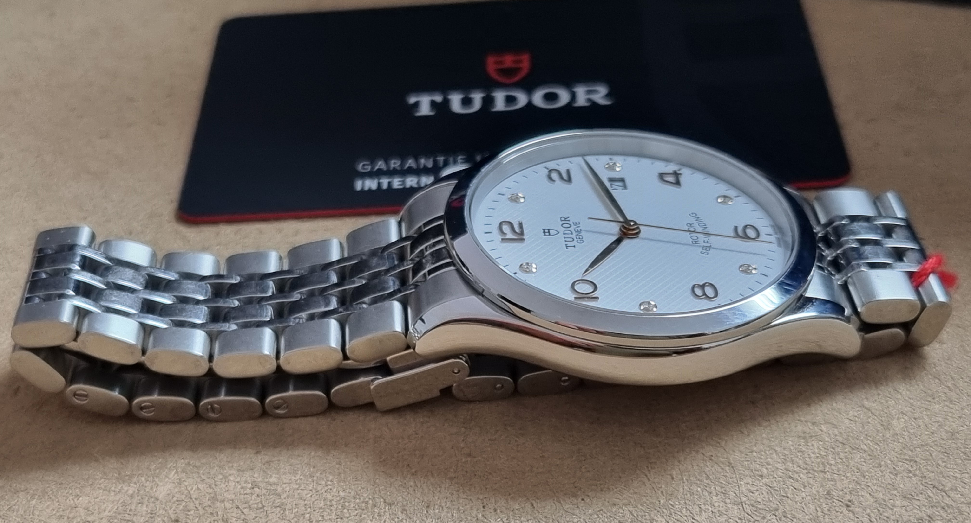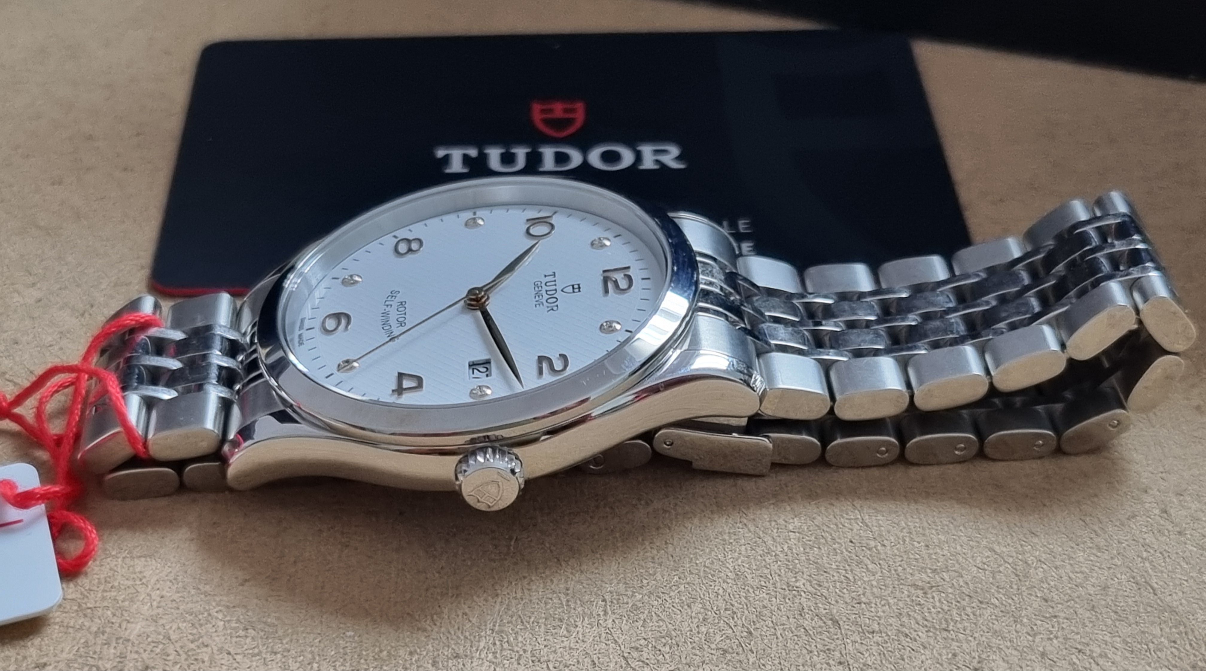 Tudor 1926 Steel 41 mm watch white dial diamonds automatic bracelet new full set 01-2022. M91650-0013 TUDOR 1926 Steel case, 41 mm White dial with diamonds Watch specifications Reference: M91650-0013 Five-year transferable warranty, no registration or mandatory service Steel case, 41 mm, polished finish Lugs: 22 mm wide Case thickness: 9.3 mm Self-winding mechanical movement, Caliber T601 Approximately 38-hour power reserve Steel screw-down crown with embossed TUDOR logo Water resistant to 100 meters Smooth steel bezel, polished finish White dial, domed, with embossed decoration and 6 diamonds Gold hour markers and hands Date display at 3 o'clock Sapphire crystal Steel bracelet, 7 rows, satin-finished outer links, polished central links, with clasp folding and safety clip N.B. : Box have defect as pics.