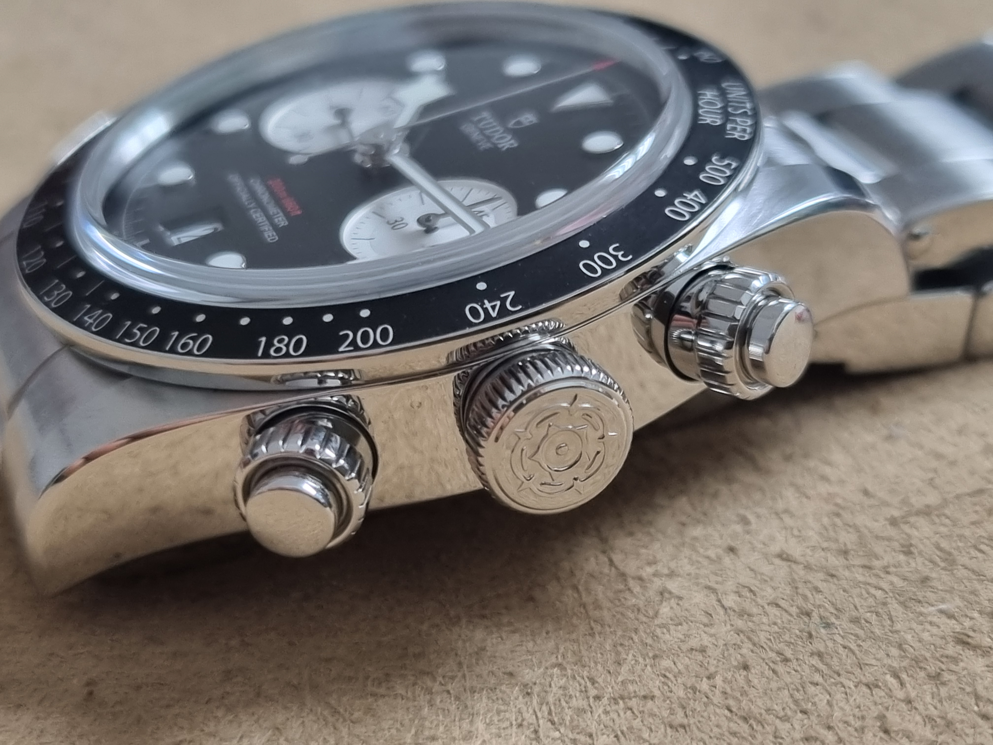 Tudor Black Bay Chrono 79360N Black Dial "Inversed Panda" Like New Box And Card 06 - 2022. M79360N-0011 Black Bay Chrono Manufacture Caliber MT5813 Steel Case, 41 mm Steel Bracelet Watch Specifications Reference: M79360N-0011 Five-Year Warranty Five-Year Warranty, Transferable, No Registration or Mandatory Service Case Steel Case, 41 mm, Polished and Satin Finish Lugs: 22 mm Wide Case Thickness: 14.4 mm Movement Manufacture Caliber MT5813 (COSC) with Chronograph Function Self-winding Mechanical Chronograph Movement with Bidirectional Rotor Power Reserve Approximately 70 hours of power reserve Wind Crown Screw-lock steel winding crown with embossed TUDOR Rose Screw-lock steel pushers at 2 o'clock and 4 Water Resistance Water resistant to 200 meters Bezel Fixed steel bezel with matte black anodized aluminum disc, tachymeter scale, and silvered graduations Dial Black with silvered subdials, domed Date display at 6 o'clock Crystal Domed sapphire crystal Bracelet Three-link steel riveted bracelet, polished and satin-brushed finish, TUDOR "T-fit" clasp with quick-adjust system