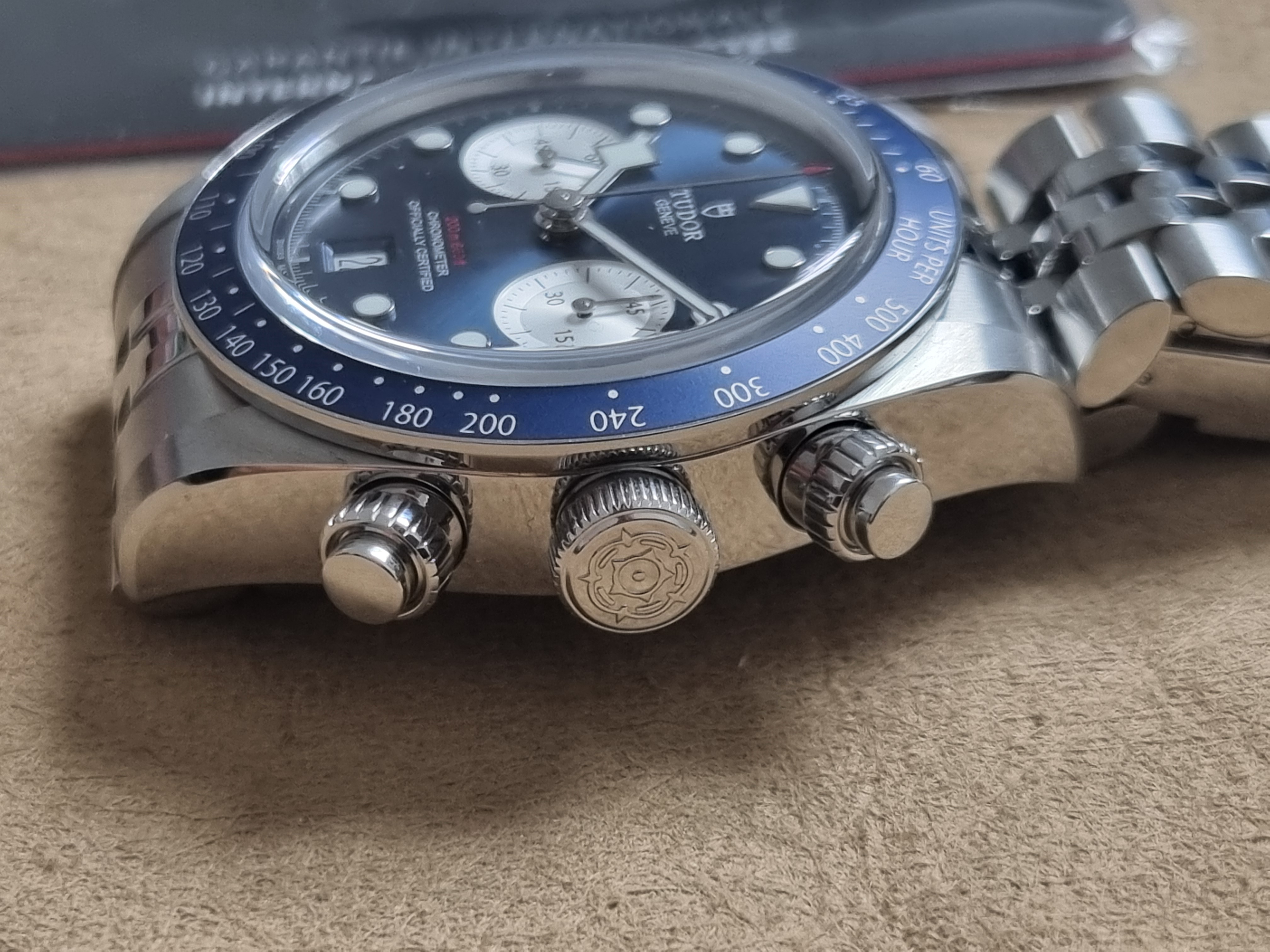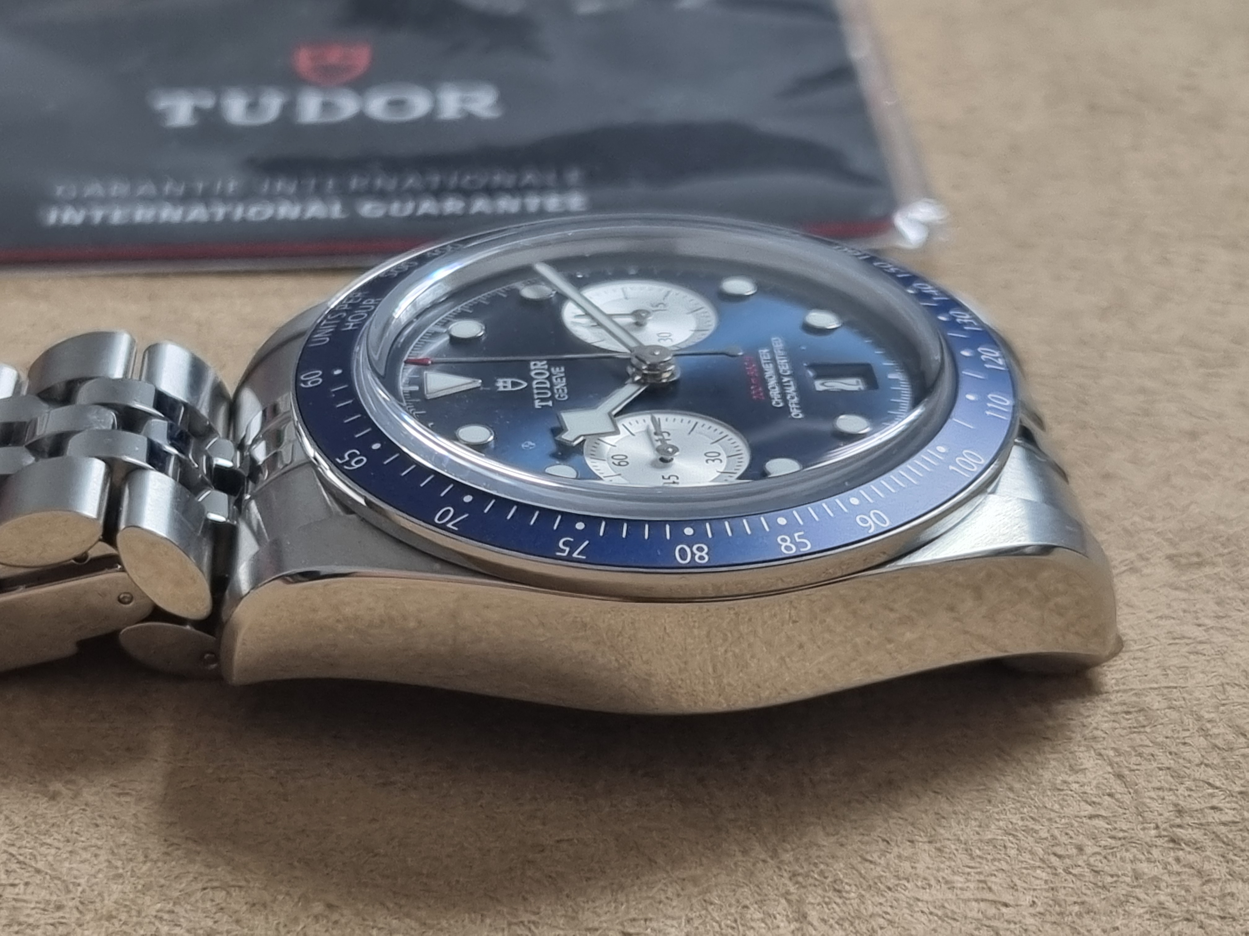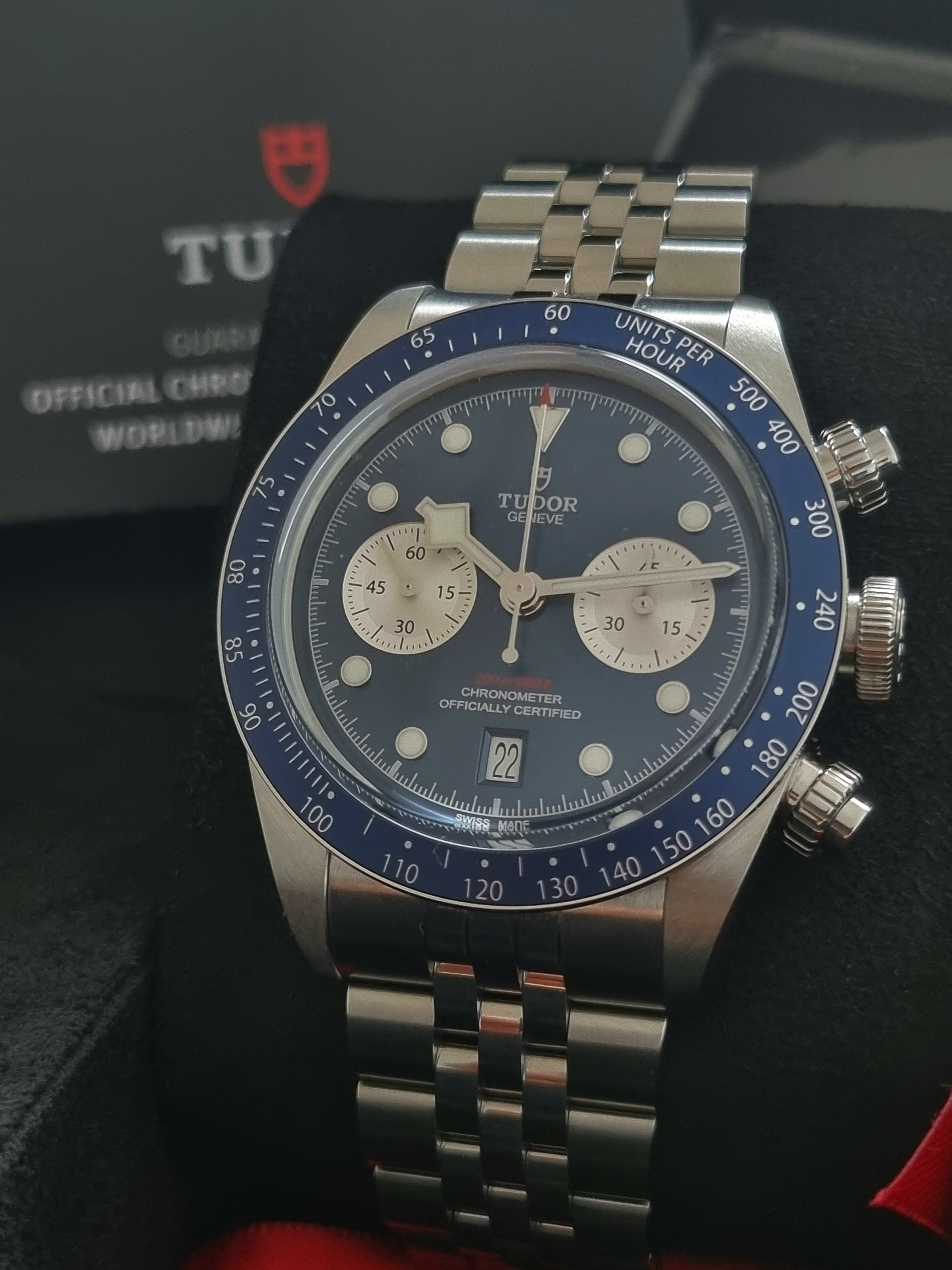 Tudor Black Bay Blue Chrono - 79360B - Steel Mm 41 - Blue Dial - Like New - Full Set 03 - 2025. M79360B-0002 Black Bay Chrono Manufacture Calibre MT5813 (COSC) Steel case, 41 mm Steel bracelet Watch specifications Reference: M79360B-0002 Five-year warranty, transferable, without registration or mandatory servicing 316L steel case, 41 mm, polished and satin-finished Lugs: 22 mm wide Case thickness: 14.4 mm Movement Manufacture Calibre MT5813 with chronograph function Mechanical self-winding chronograph movement with bidirectional rotor Autonomy of approximately 70 hours 316L steel screw-down winding crown with TUDOR rose in relief 316L steel screw-down pushers at 2 and 4 o'clock Water-resistant to 200 meters Fixed 316L steel bezel with blue anodized aluminum disc and tachometric scale with silvered graduations Dial Blue with silvered counters, domed Date display at 6 o'clock Domed sapphire crystal Five-link bracelet in 316L steel, polished and satin-finished, TUDOR “T-fit” clasp with quick adjustment system
