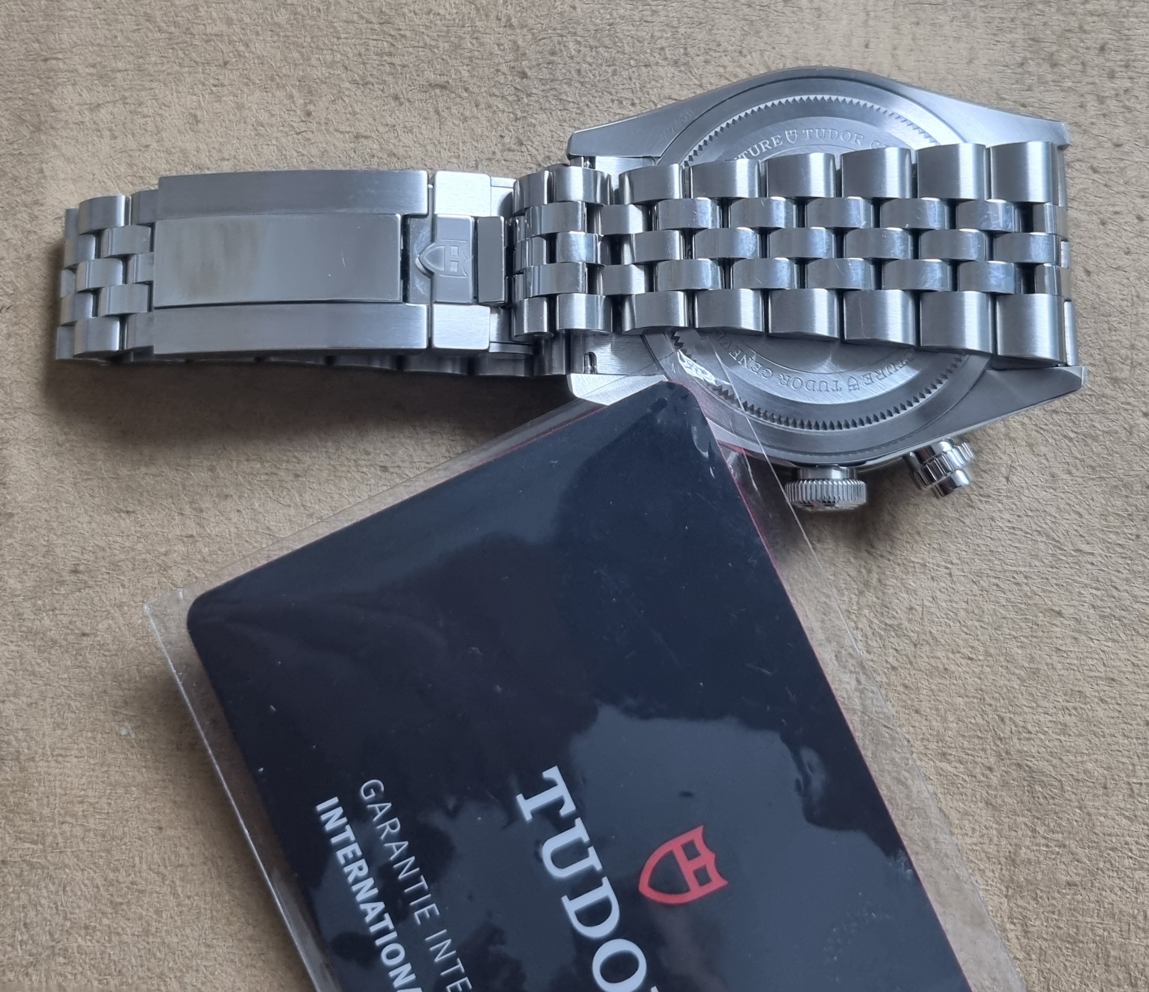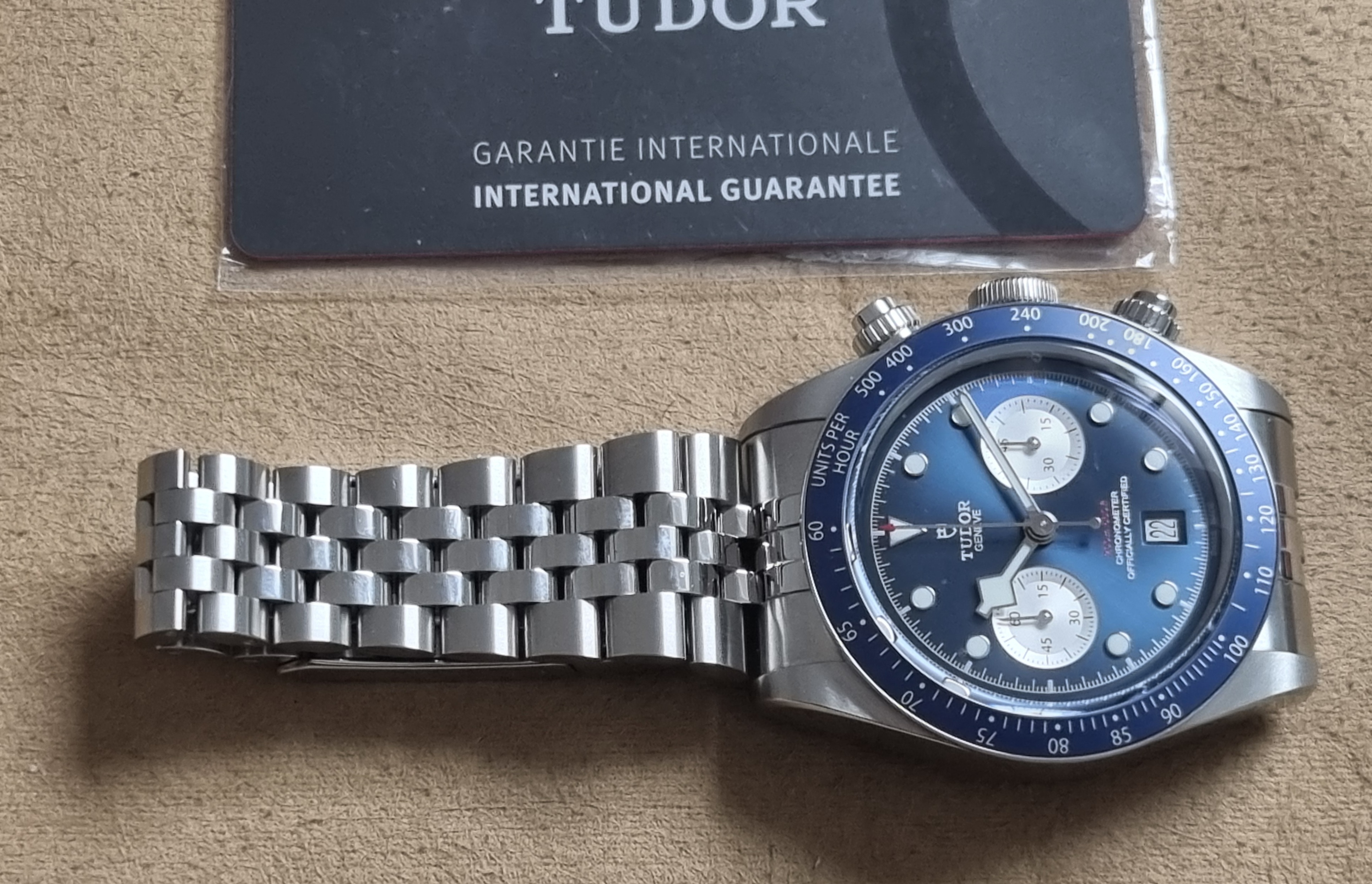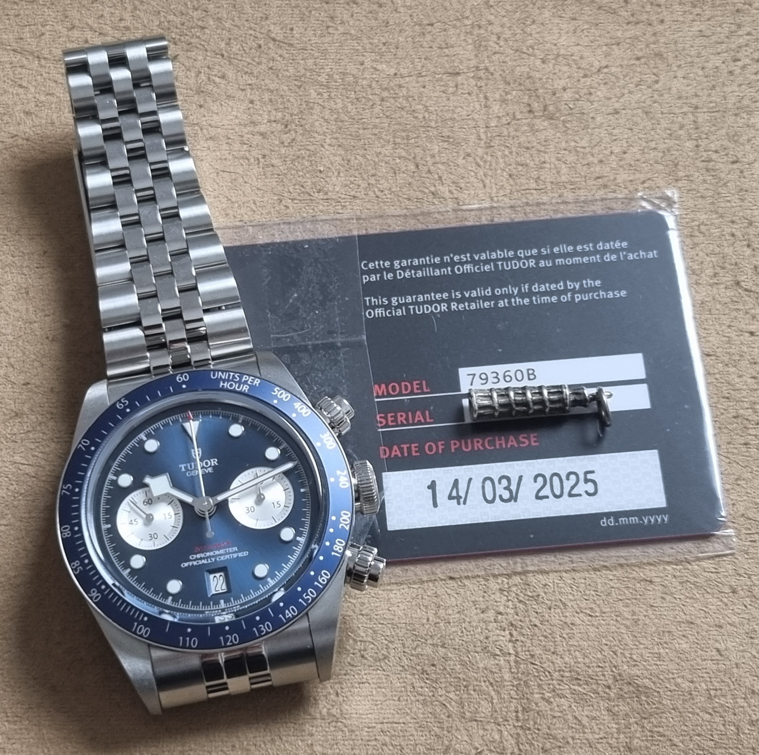 Tudor Black Bay Blue Chrono - 79360B - Steel Mm 41 - Blue Dial - Like New - Full Set 03 - 2025. M79360B-0002 Black Bay Chrono Manufacture Calibre MT5813 (COSC) Steel case, 41 mm Steel bracelet Watch specifications Reference: M79360B-0002 Five-year warranty, transferable, without registration or mandatory servicing 316L steel case, 41 mm, polished and satin-finished Lugs: 22 mm wide Case thickness: 14.4 mm Movement Manufacture Calibre MT5813 with chronograph function Mechanical self-winding chronograph movement with bidirectional rotor Autonomy of approximately 70 hours 316L steel screw-down winding crown with TUDOR rose in relief 316L steel screw-down pushers at 2 and 4 o'clock Water-resistant to 200 meters Fixed 316L steel bezel with blue anodized aluminum disc and tachometric scale with silvered graduations Dial Blue with silvered counters, domed Date display at 6 o'clock Domed sapphire crystal Five-link bracelet in 316L steel, polished and satin-finished, TUDOR “T-fit” clasp with quick adjustment system