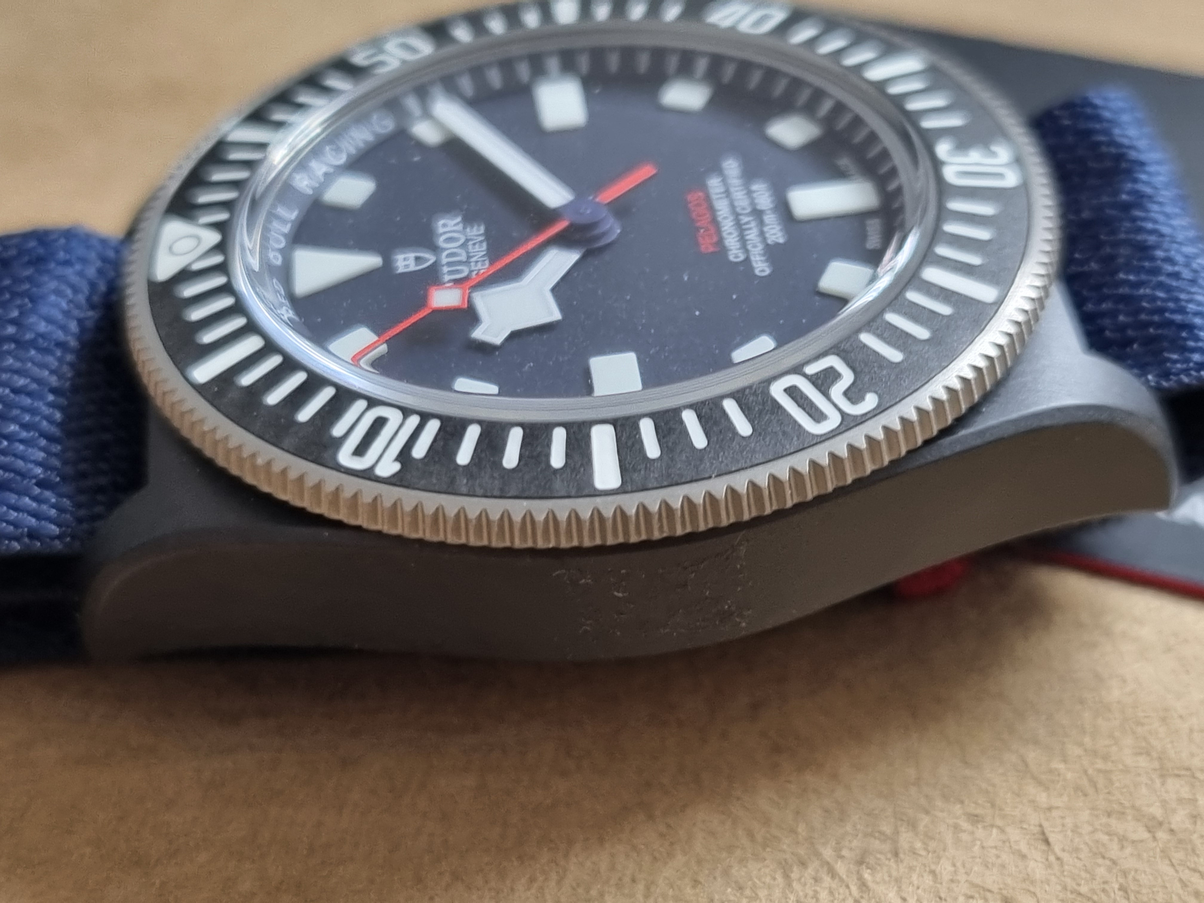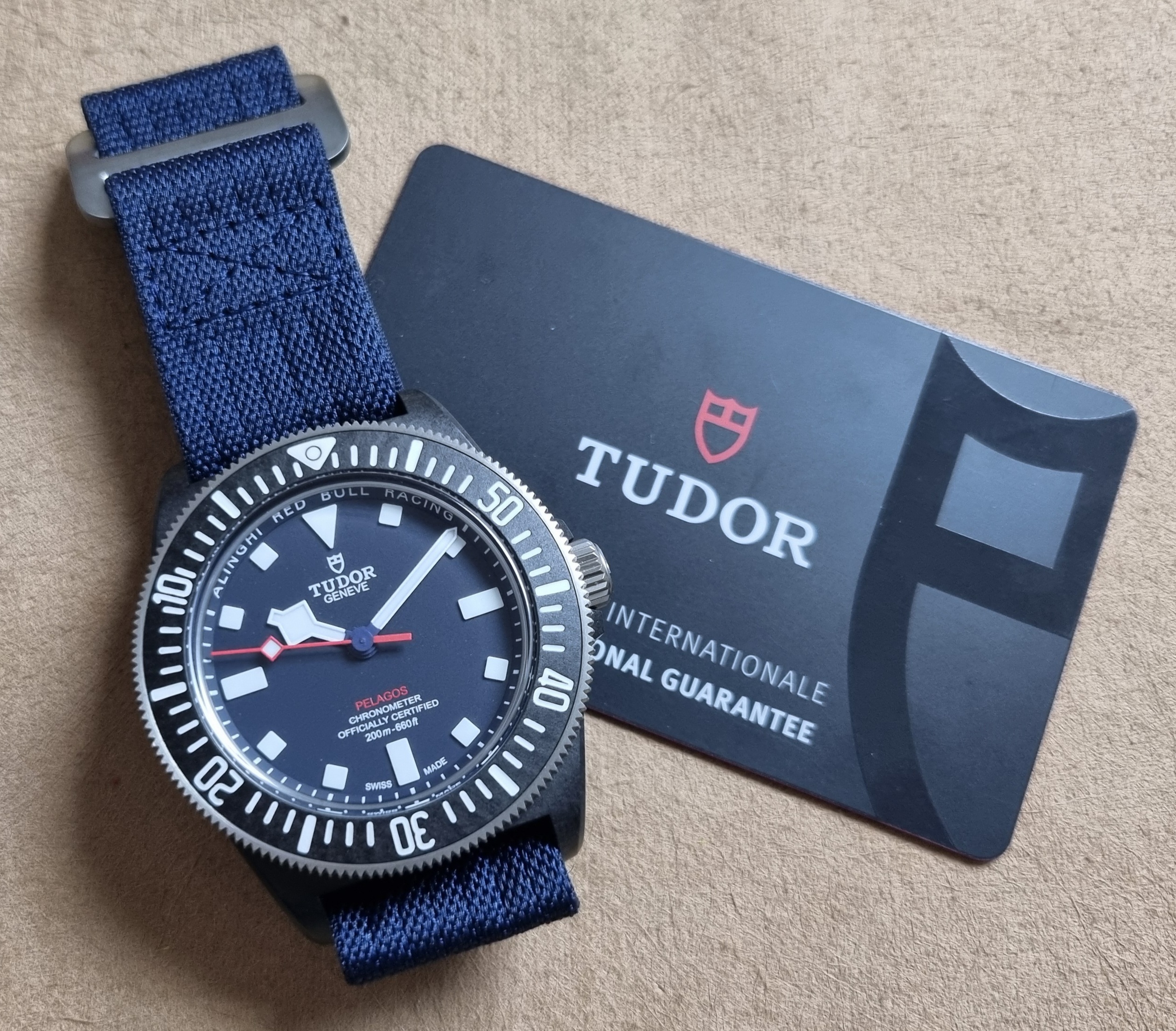 Tudor Pelagos Alinghi Red Bull Pelagos Fxd – Racing 25707KN 42 MM Full Set New 2024. M25707KN-0001 Pelagos FXD Manufacture Calibre MT5602 (COSC) Black carbon composite case, 42 mm Blue fabric strap Five-year warranty Five-year warranty, transferable, without registration or mandatory servicing Case Black carbon composite case with matte finish, 42 mm, Alinghi Red Bull Racing logo engraved on the case back Lugs: 22 mm wide Case thickness: 12.8 mm Movement Manufacture Calibre MT5602 (COSC) Self-winding mechanical movement with bidirectional rotor Power reserve Approximately 70 hours of power reserve Wind crown Titanium screw-down winding crown with TUDOR shield in relief Water resistance Water resistant to 200 meters Bezel Bidirectional 60-minute graduated titanium bezel, matt black carbon composite disc, 120 notches Dial Matt blue Glass Sapphire crystal Bracelet Blue fabric strap with hook-and-loop closure system Box and warranty card.