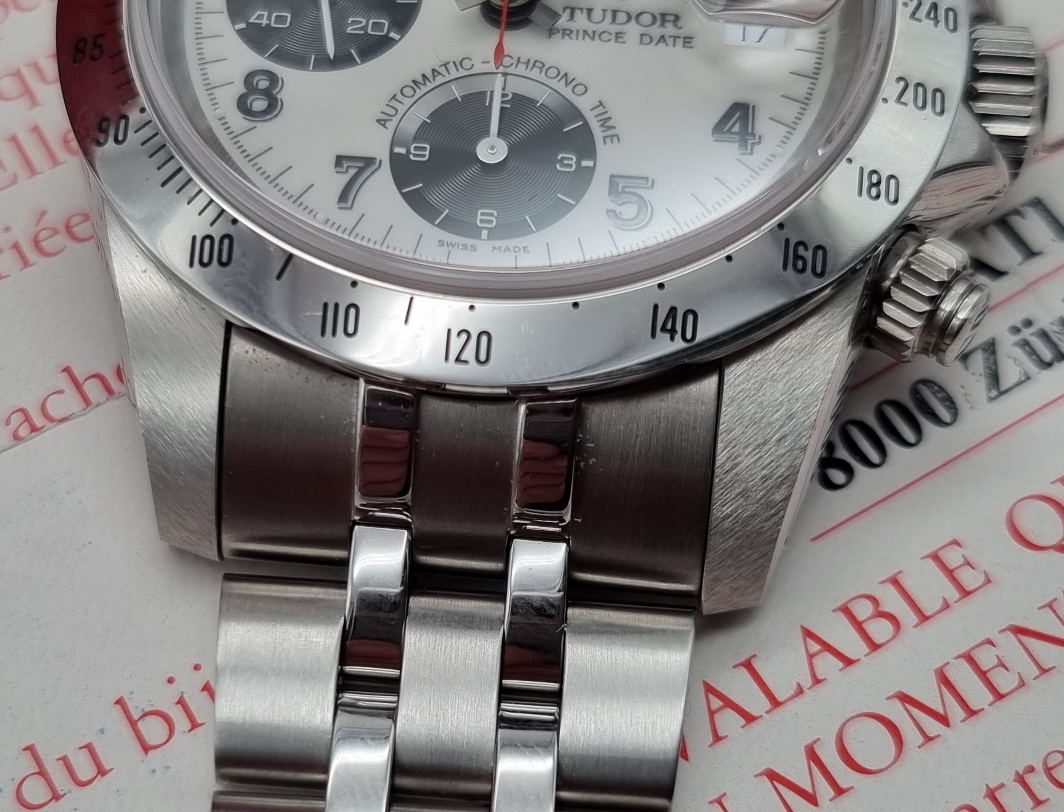Tudor Prince Date 79280 Prince Date Chrono never polished like new sticker at back full links full set 2000. Stainless steel case mm 40 - sapphire glass. White and black dial - arabic numerals. Automatic movement perfect working. Screw caseback , crown and buttons. Sticker at back as pics. Tudor steel bracelet with n. 14 links , full. Comes with box , outerbox , translation , plastic wallet, warranty paper and instruction booklet. Coondition is very like new and is neve r polished as pics. Very rare to find in this condition. N. B. : Never polished - like new as pics. Sticker at back. Full links. Full set 2000.