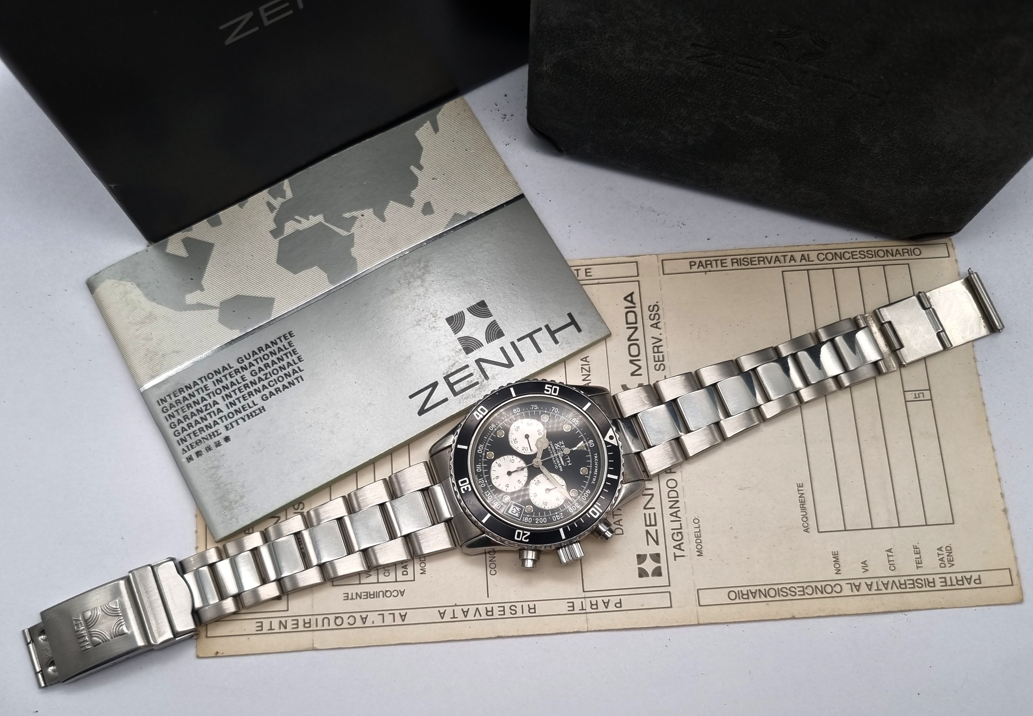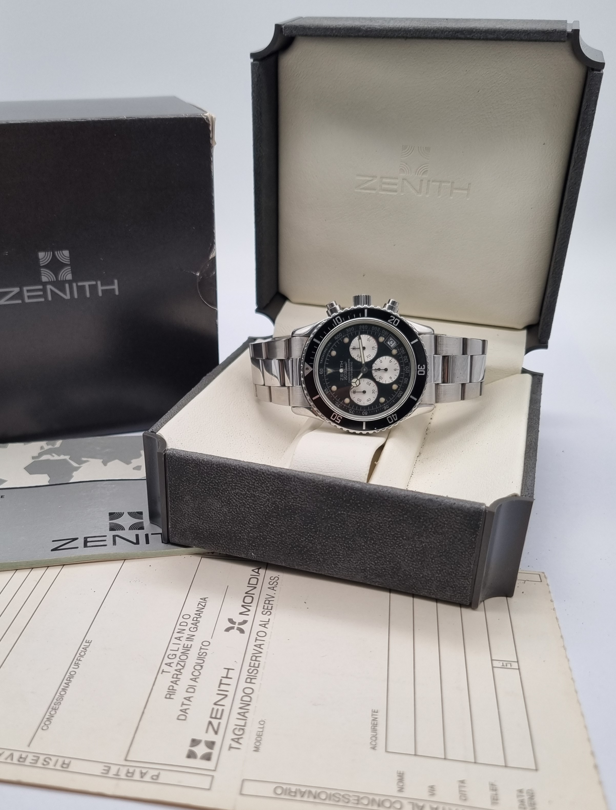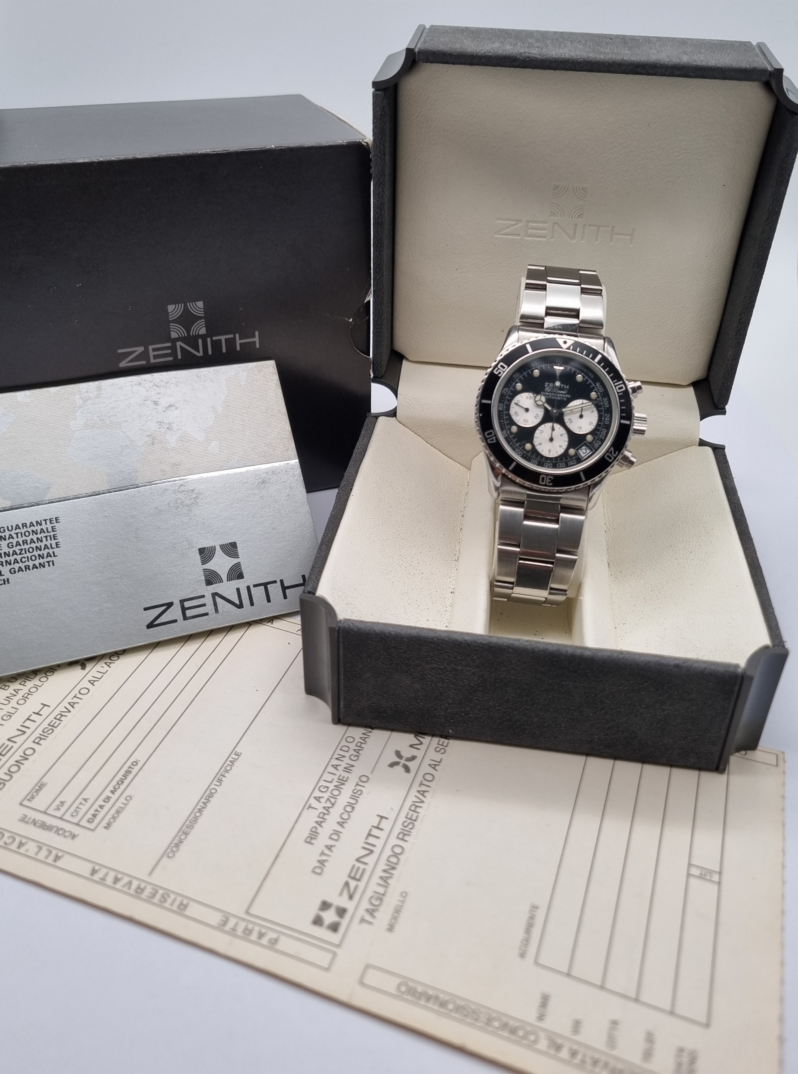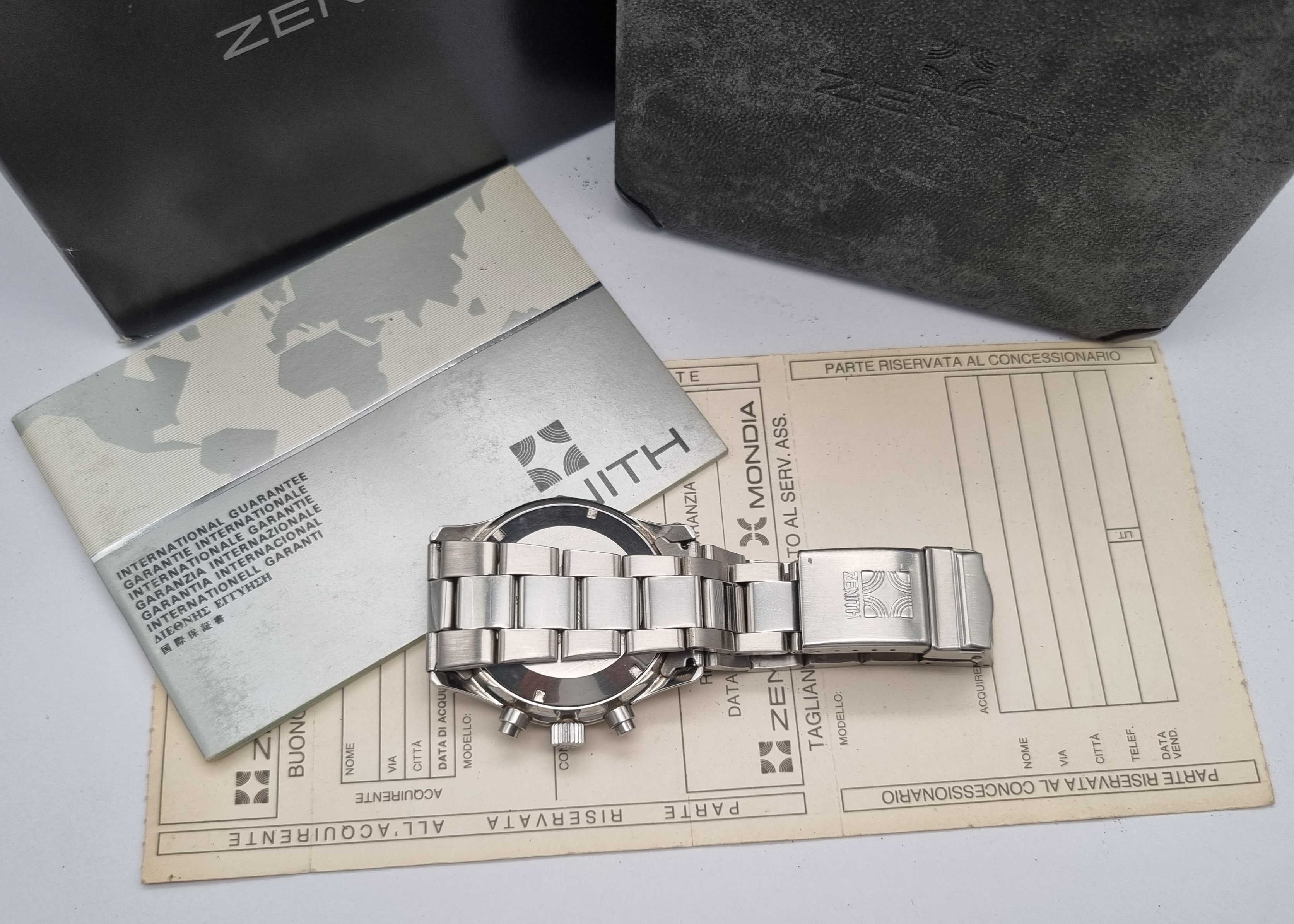 Zenith El Primero De Luca Chronograph 02.0310.400 Steel 40 Black Dial Caliber 400 Full Set 1990. Reference 02.0310.400 Year of production: 1990 Steel case, excluding crown, 40 mm Case thickness: 13 mm including sapphire crystal Steel screw-down case back Steel bezel with black aluminum insert Plastic crystal Black dial with three silver-colored subdials and date display Automatic mechanical movement, caliber 400 – 31 jewels Original Zenith steel bracelet with 12 links and sub extension Zenith box, booklet, and warranty blank - as pics Notes and condition: Stunning Zenith El Primero chronograph, steel, 1990, steel bezel with black insert, plastic crystal, black dial with three horizontal silver-colored subdials and date display, self-winding movement, Zenith steel bracelet. Watch serviced in good condition, original Zenith box, warranty booklet and blank warranty paper.