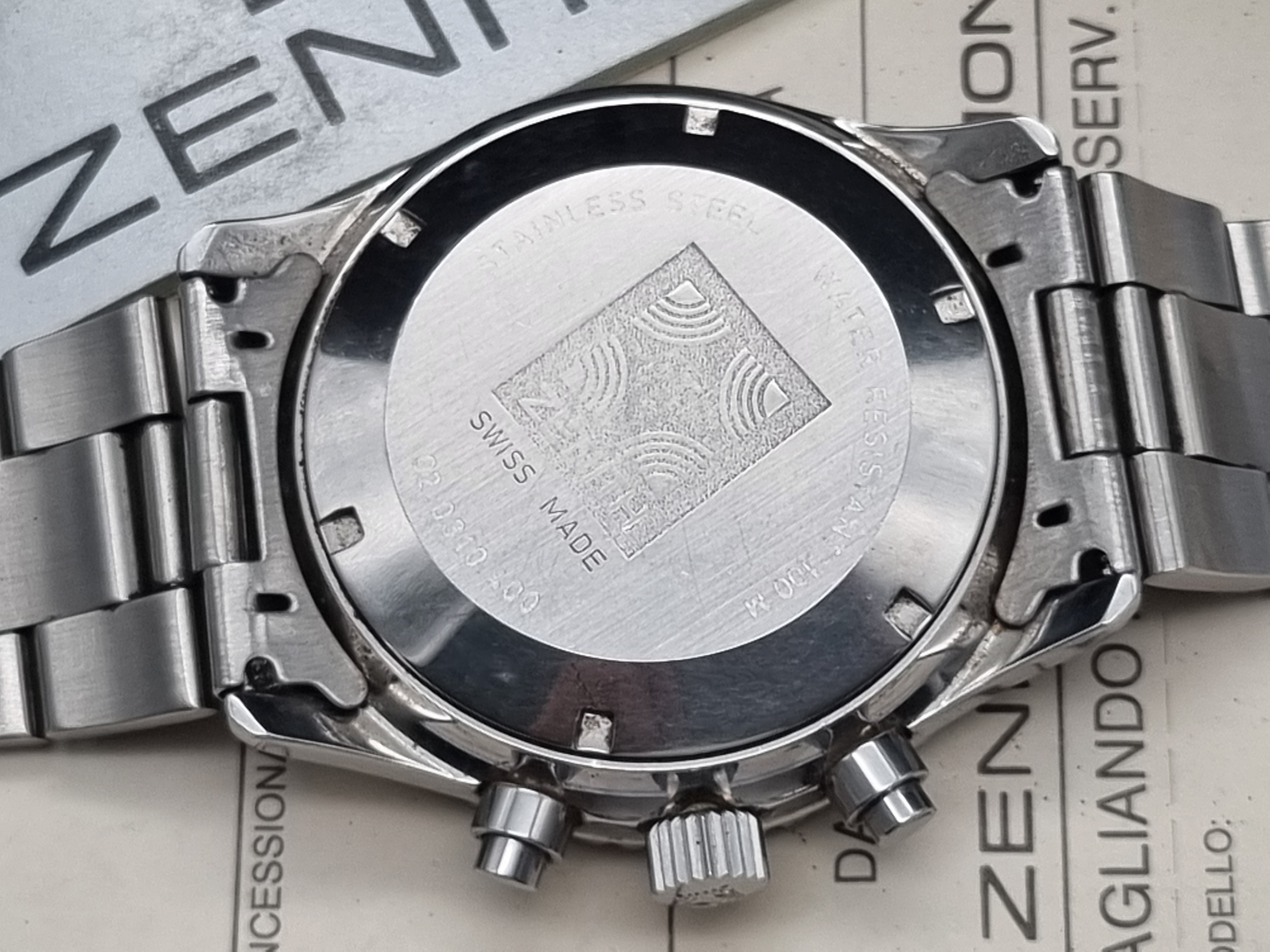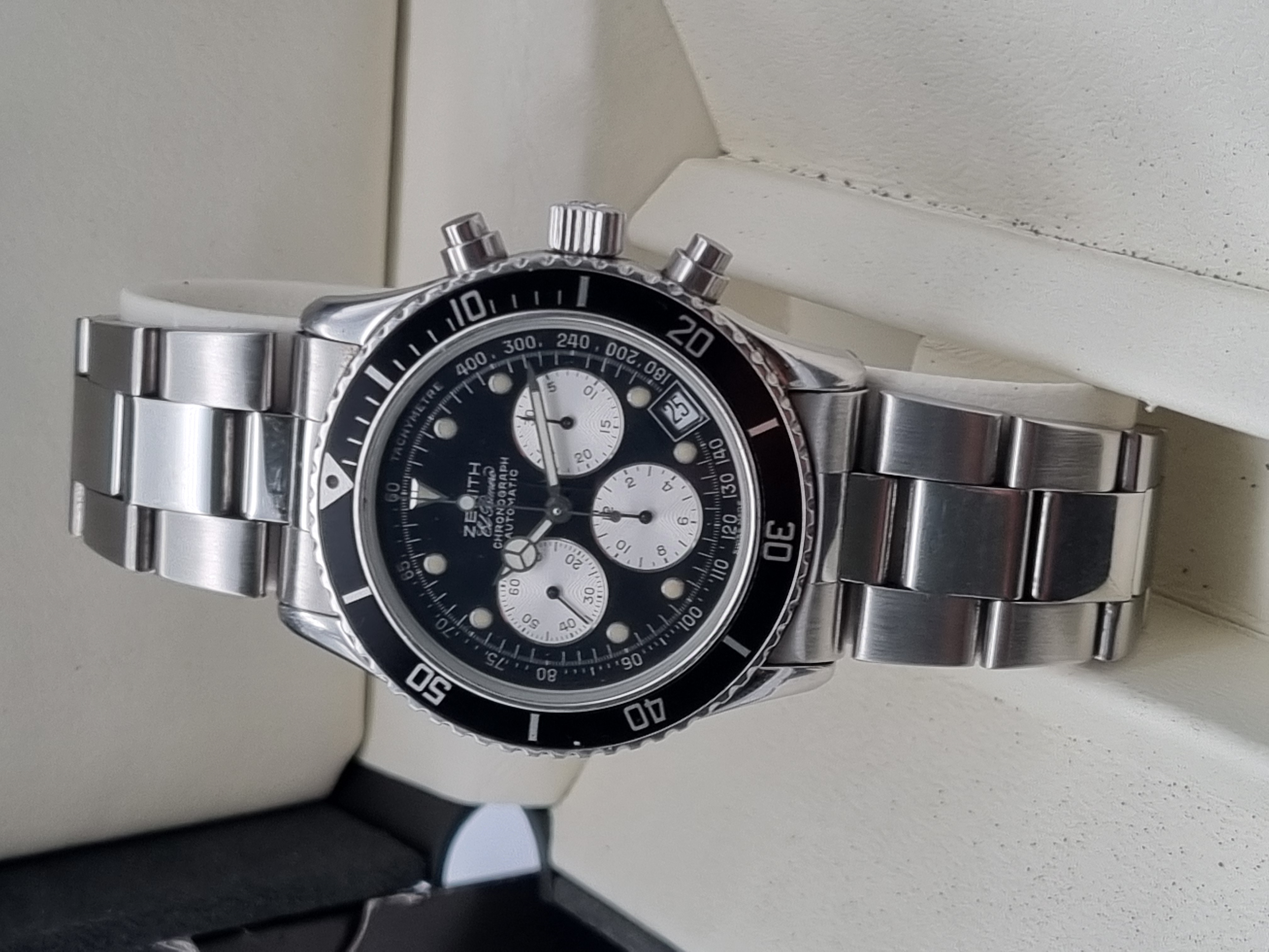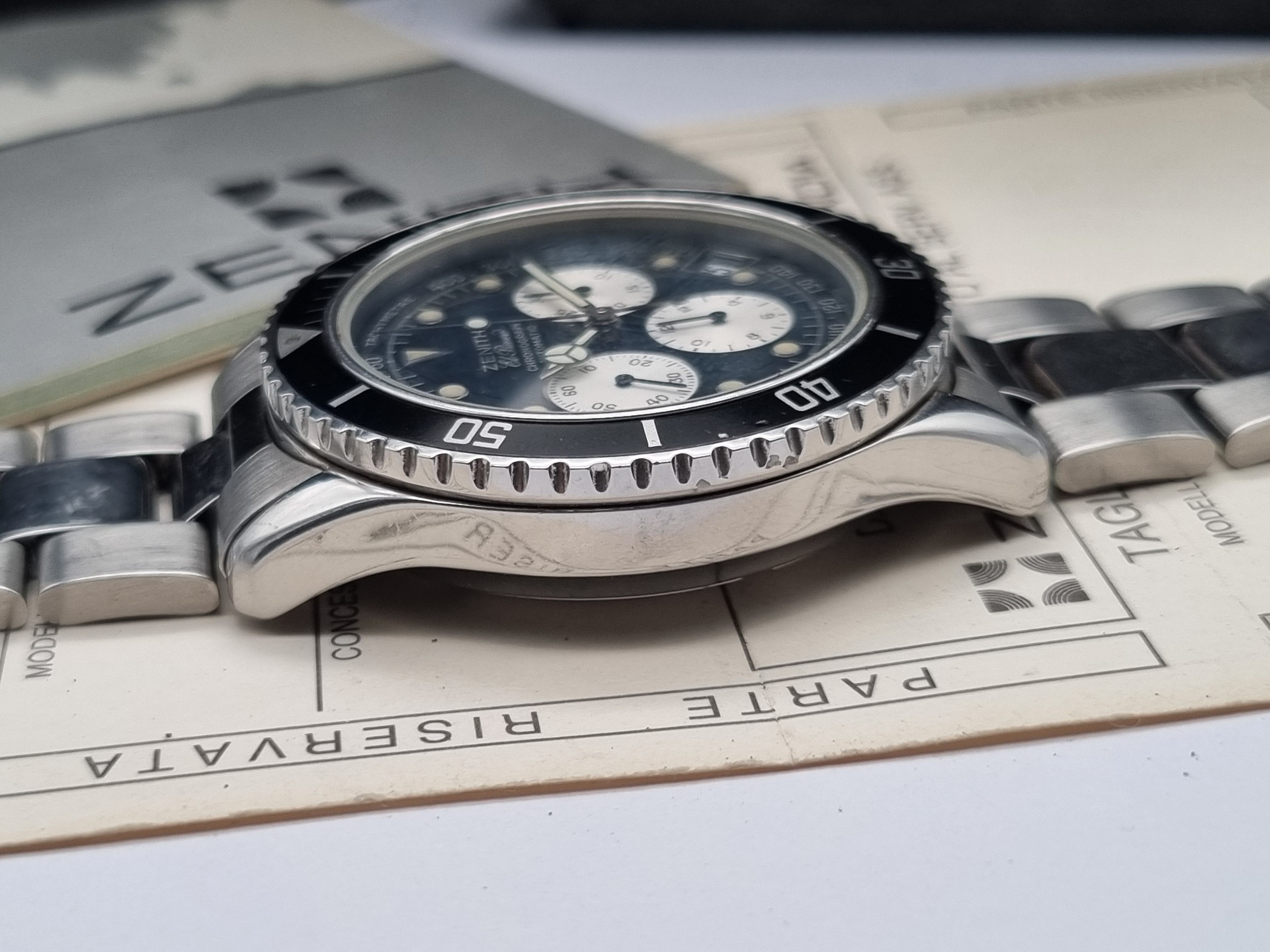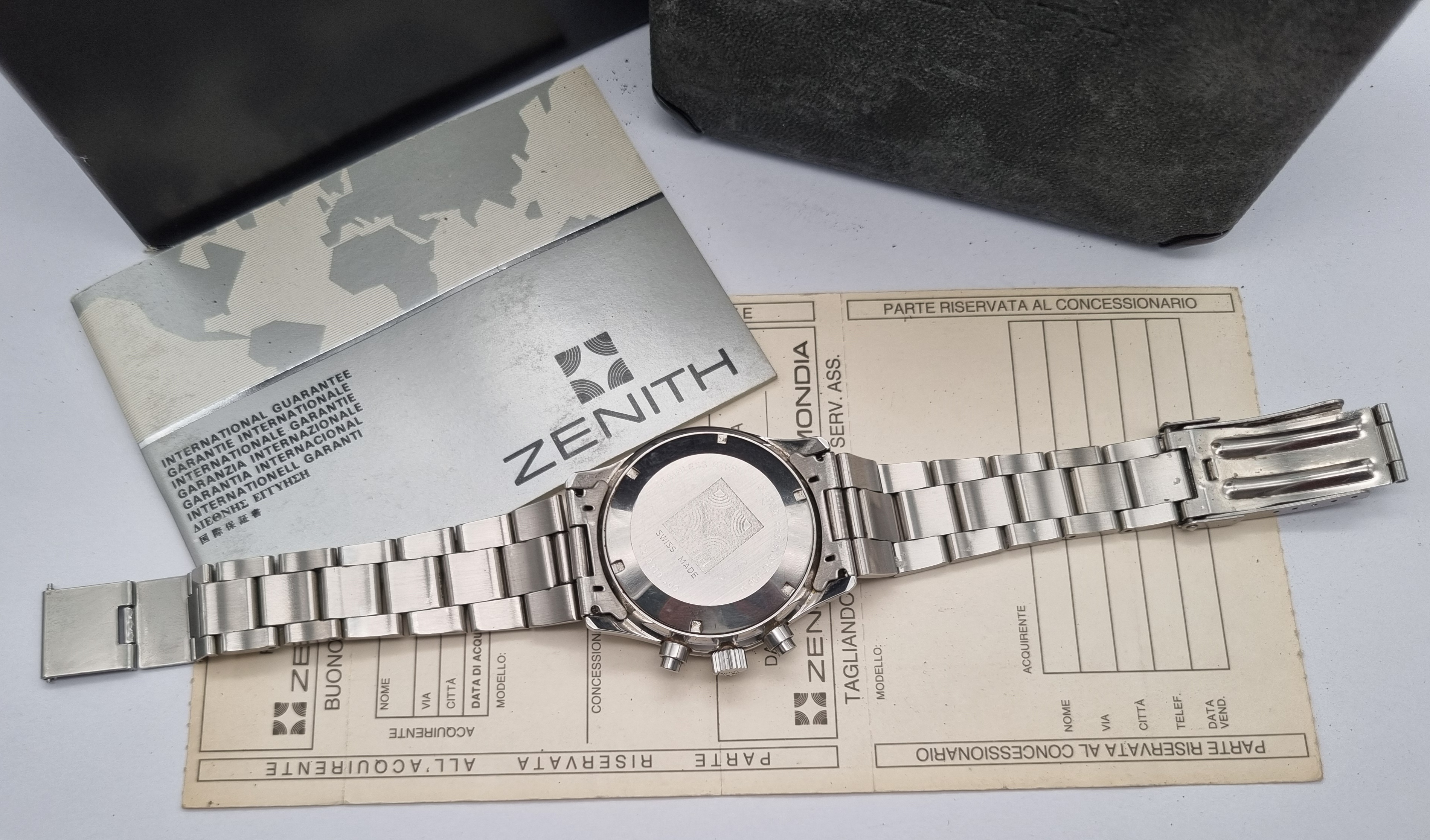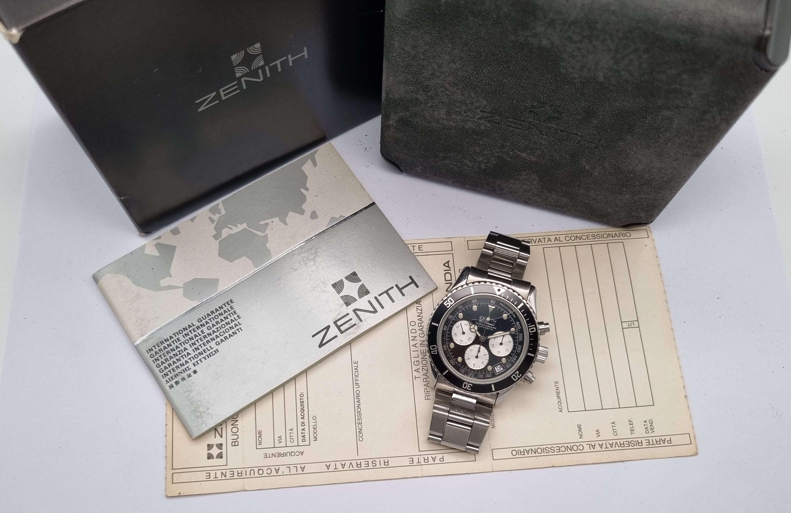 Zenith El Primero De Luca Chronograph 02.0310.400 Steel 40 Black Dial Caliber 400 Full Set 1990. Reference 02.0310.400 Year of production: 1990 Steel case, excluding crown, 40 mm Case thickness: 13 mm including sapphire crystal Steel screw-down case back Steel bezel with black aluminum insert Plastic crystal Black dial with three silver-colored subdials and date display Automatic mechanical movement, caliber 400 – 31 jewels Original Zenith steel bracelet with 12 links and sub extension Zenith box, booklet, and warranty blank - as pics Notes and condition: Stunning Zenith El Primero chronograph, steel, 1990, steel bezel with black insert, plastic crystal, black dial with three horizontal silver-colored subdials and date display, self-winding movement, Zenith steel bracelet. Watch serviced in good condition, original Zenith box, warranty booklet and blank warranty paper.