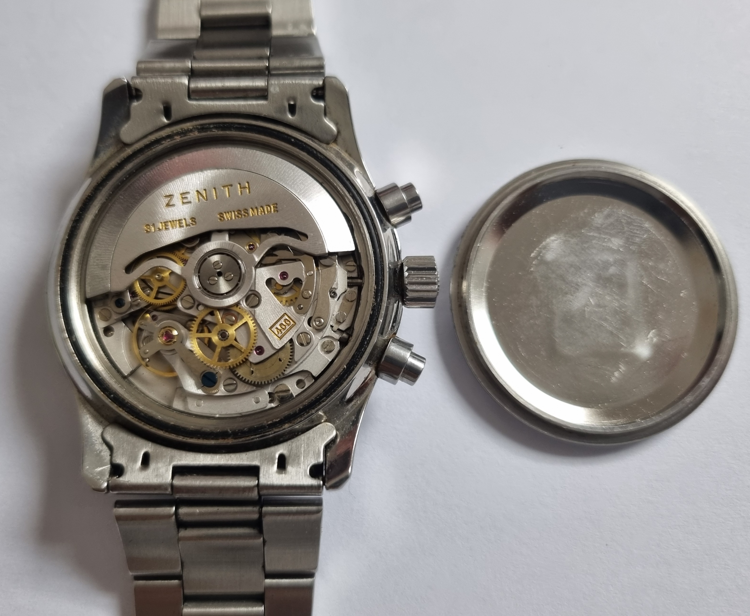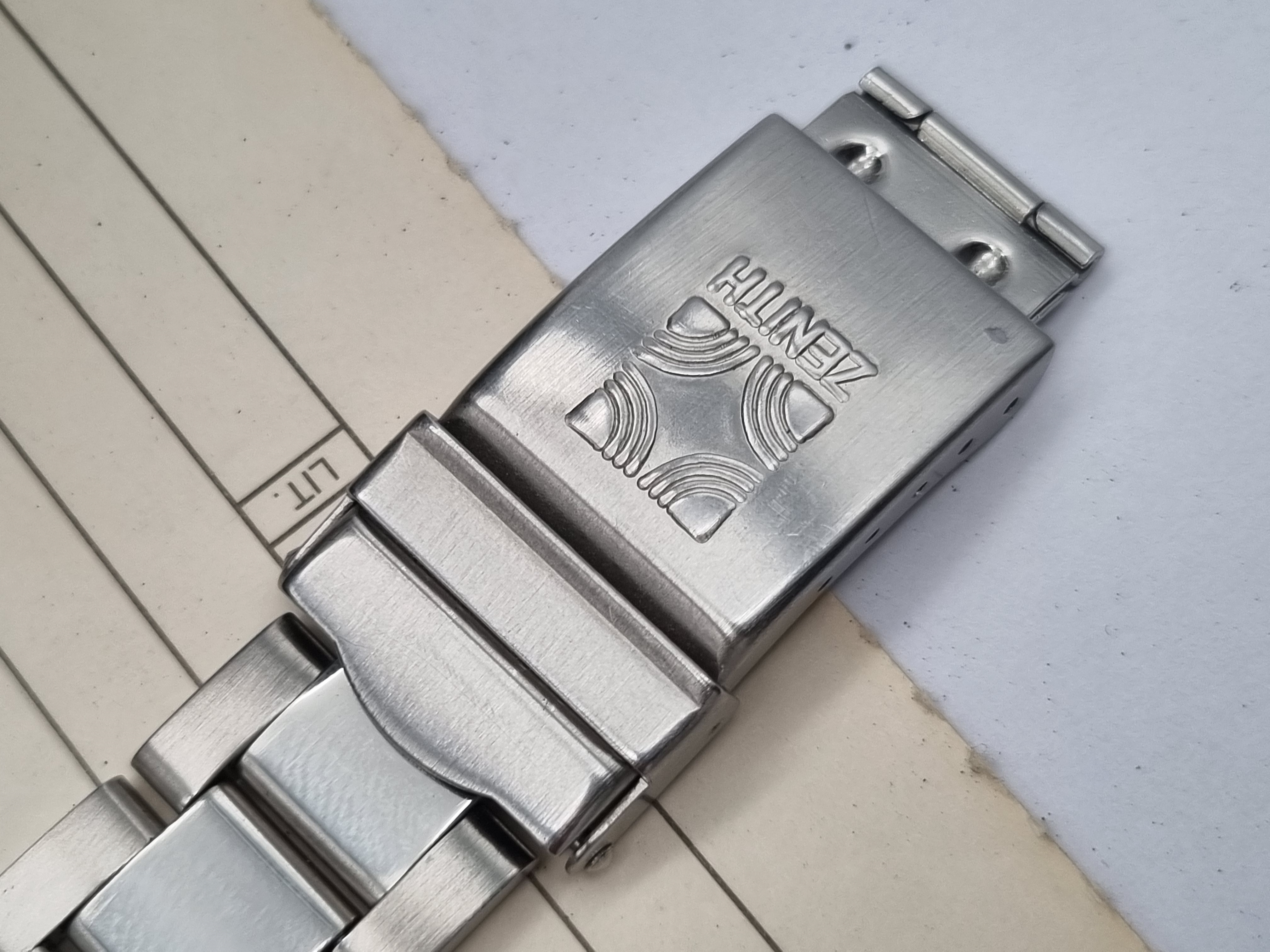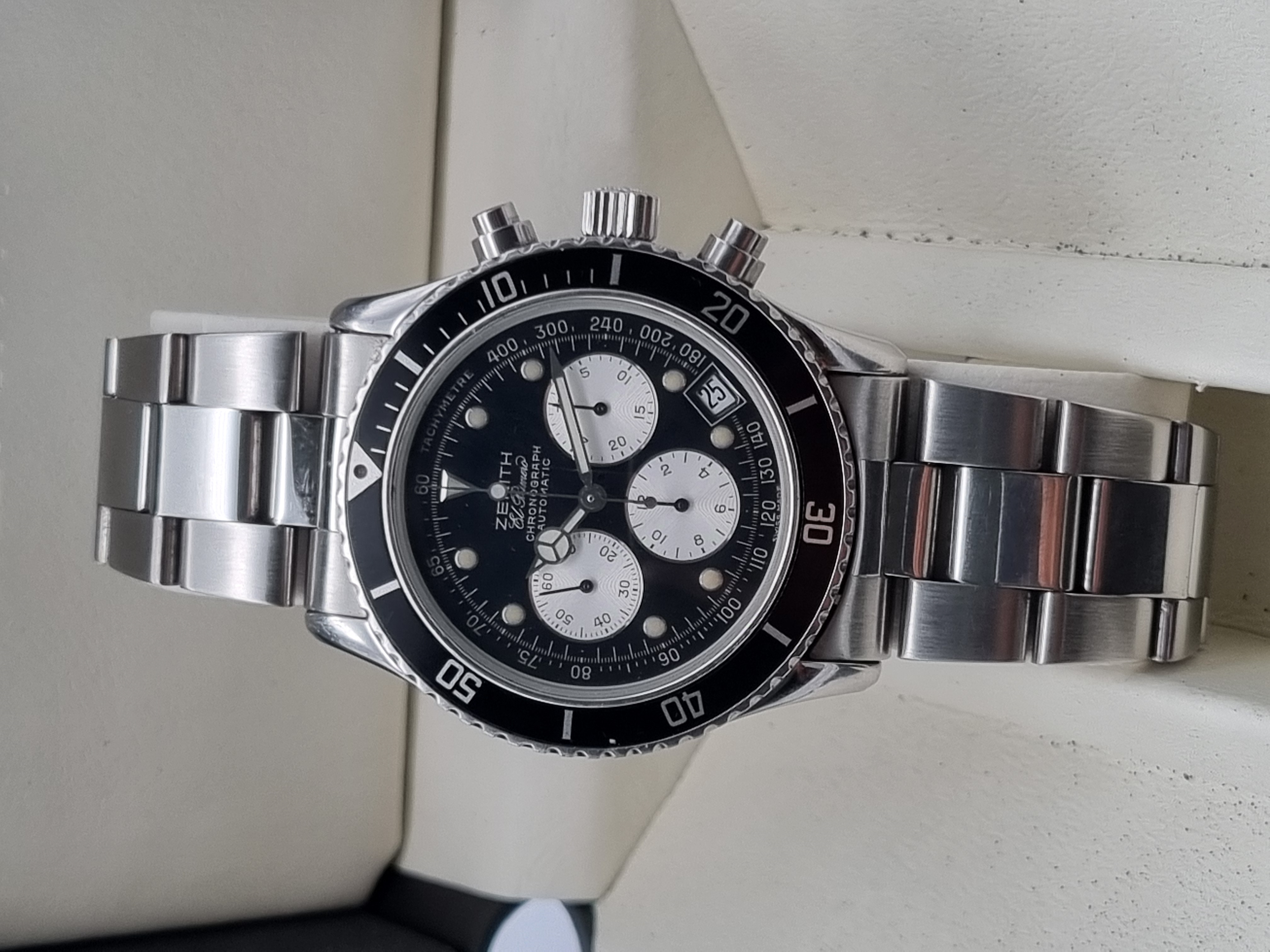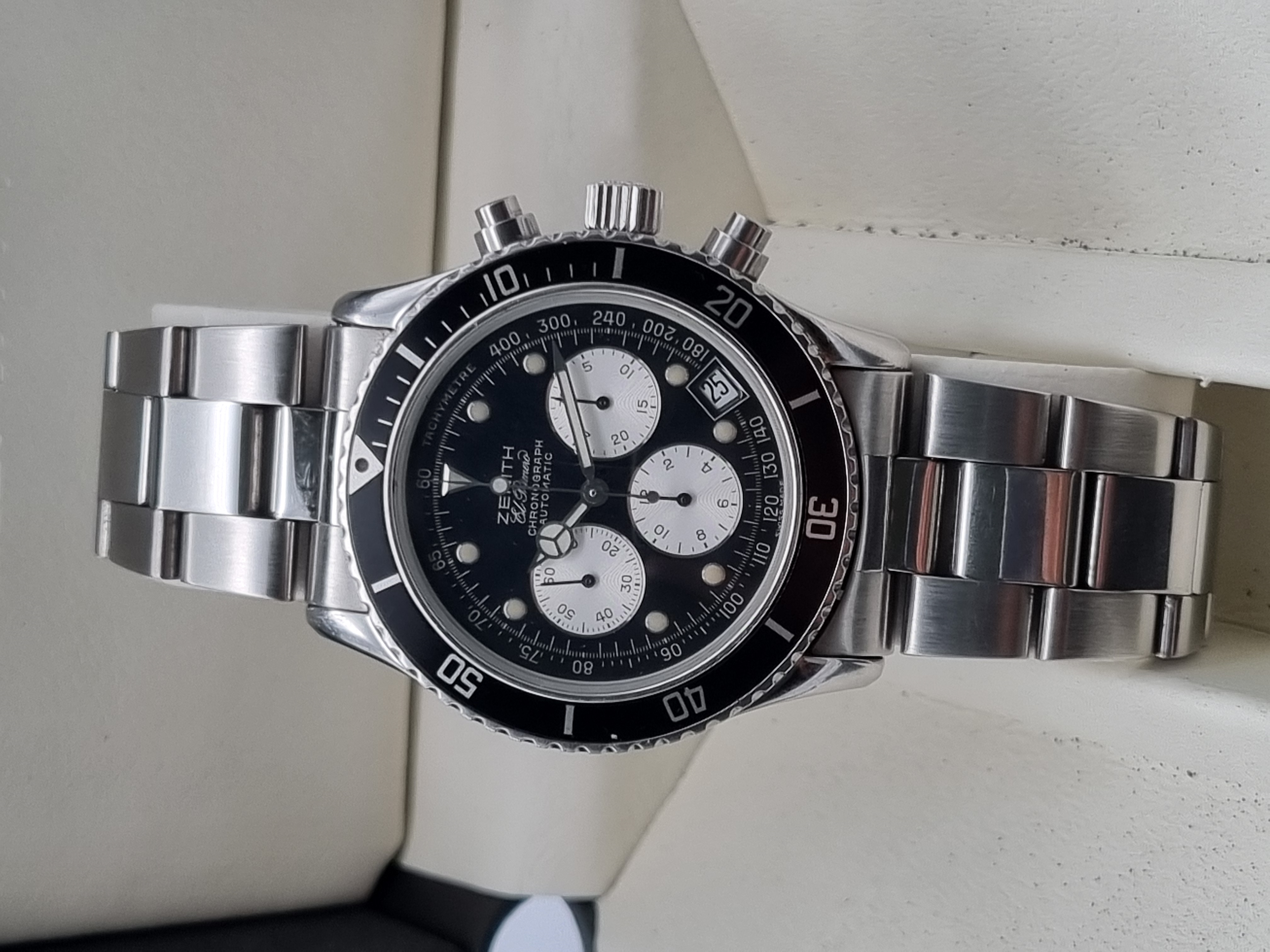 Zenith El Primero De Luca Chronograph 02.0310.400 Steel 40 Black Dial Caliber 400 Full Set 1990. Reference 02.0310.400 Year of production: 1990 Steel case, excluding crown, 40 mm Case thickness: 13 mm including sapphire crystal Steel screw-down case back Steel bezel with black aluminum insert Plastic crystal Black dial with three silver-colored subdials and date display Automatic mechanical movement, caliber 400 – 31 jewels Original Zenith steel bracelet with 12 links and sub extension Zenith box, booklet, and warranty blank - as pics Notes and condition: Stunning Zenith El Primero chronograph, steel, 1990, steel bezel with black insert, plastic crystal, black dial with three horizontal silver-colored subdials and date display, self-winding movement, Zenith steel bracelet. Watch serviced in good condition, original Zenith box, warranty booklet and blank warranty paper.