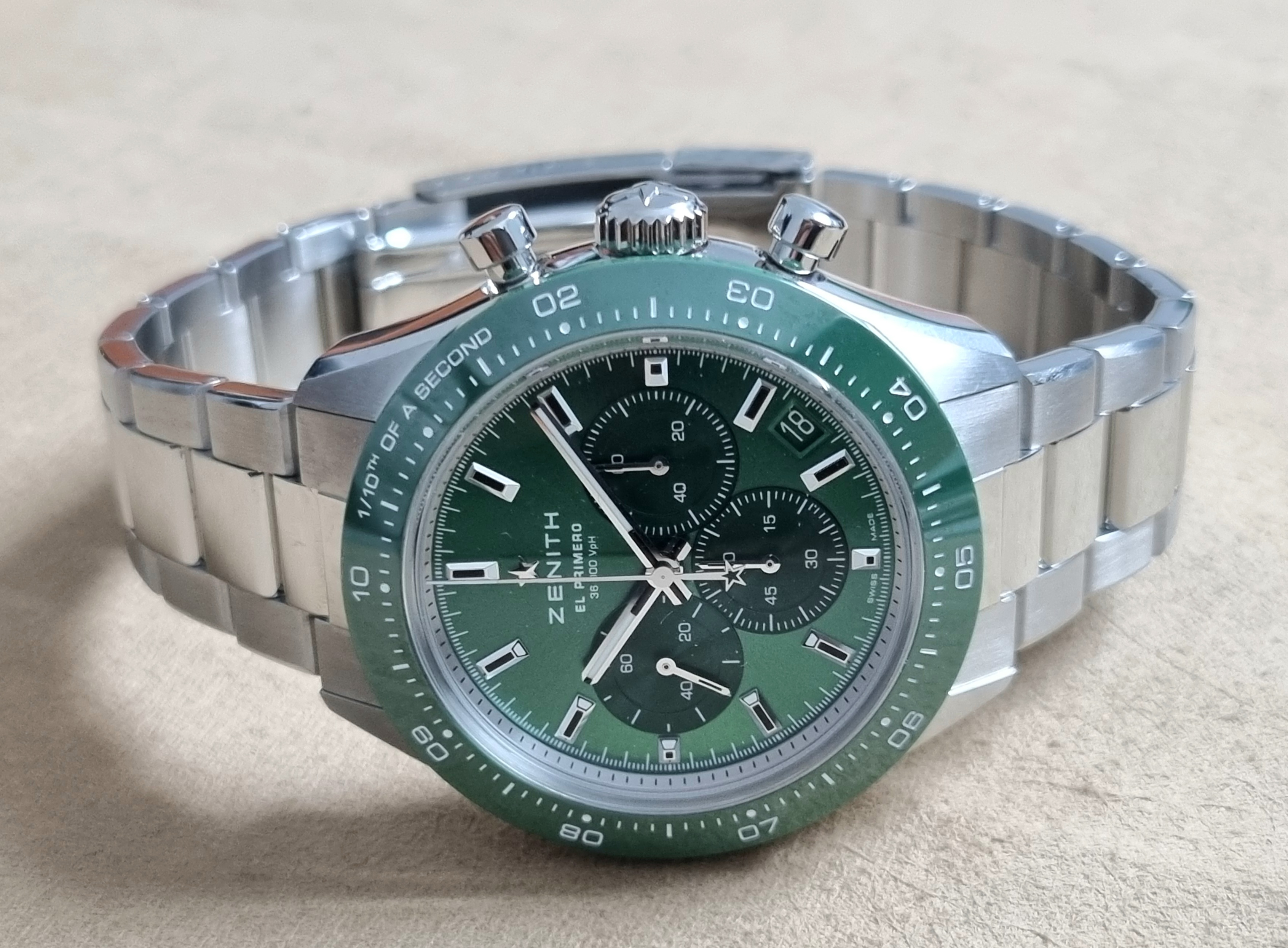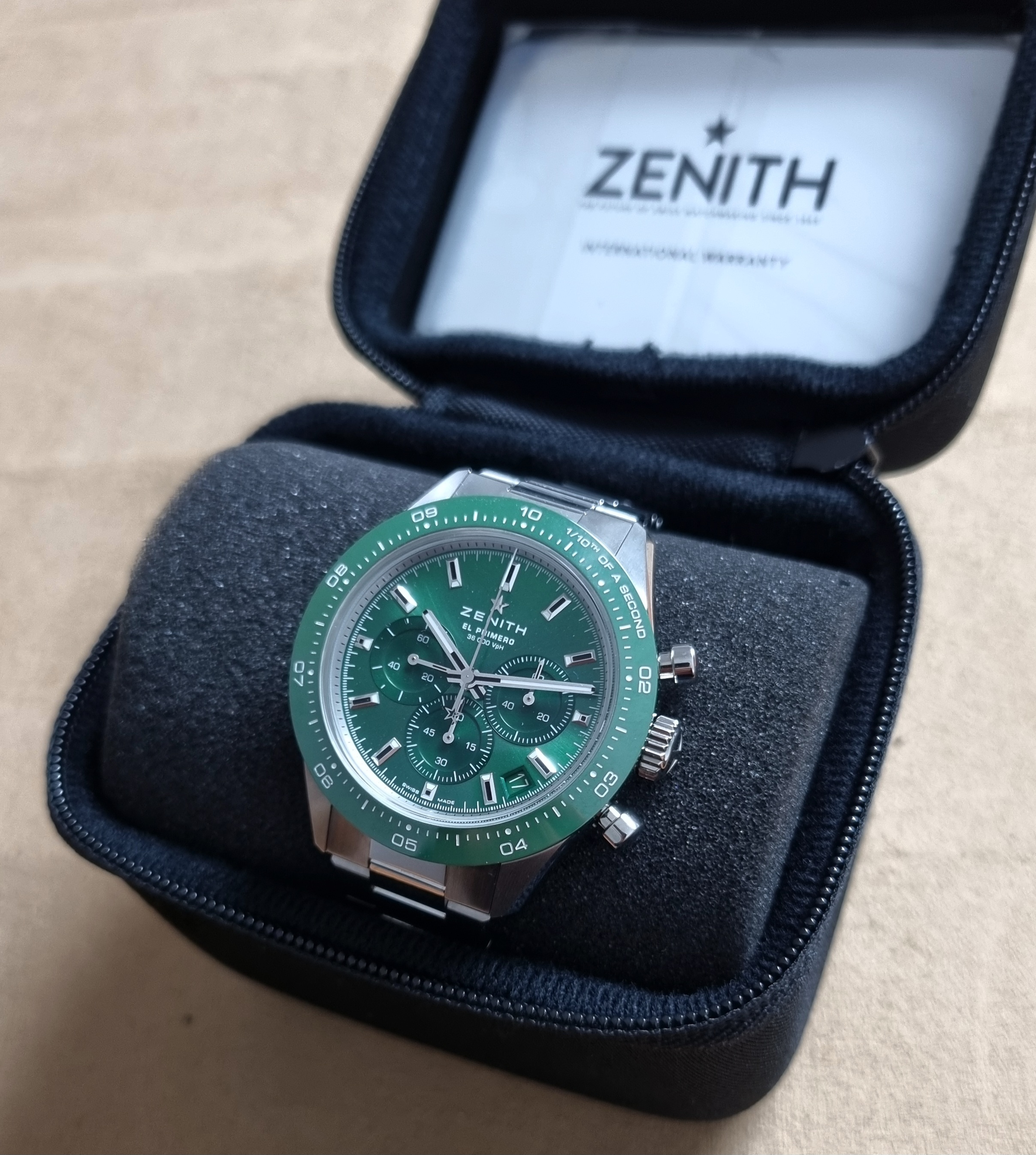 Zenith Chronomaster Sport Yoshida Special Edition Limited To 244 Pieces 03.3107.3600/56.M3100. Watches Stainless steel Mechanical Automatic Green Dial. New Travel box and Warranty Card 04-2024. Brand: Zenith Product Name: Chronomaster Sport YOSHIDA Special, Limited to 244 Pieces Model Number: 03.3107.3600/56.M3100 Item: Men's Material: Stainless Steel Accessories: Travel Box and Warranty Card Warranty Date: April 2024 Case Size: Approximately 41 mm Country of Origin: Switzerland Year of Production: 2024 Movement: Self-Winding Display Type: Chronograph Case Shape: Round Dial Dial Color: Green The watch is new and unused, with a protective seal on the bracelet clasp. The deep green dial is a Yoshida specification, and the sunray finish creates a variety of expressions depending on the angle of light. The movement is a high-frequency El Primero caliber 3600, capable of measuring 1/10th of a second chronograph, and the exquisite mechanism can be admired through the transparent case back. Limited edition of 244 pieces in Japan.